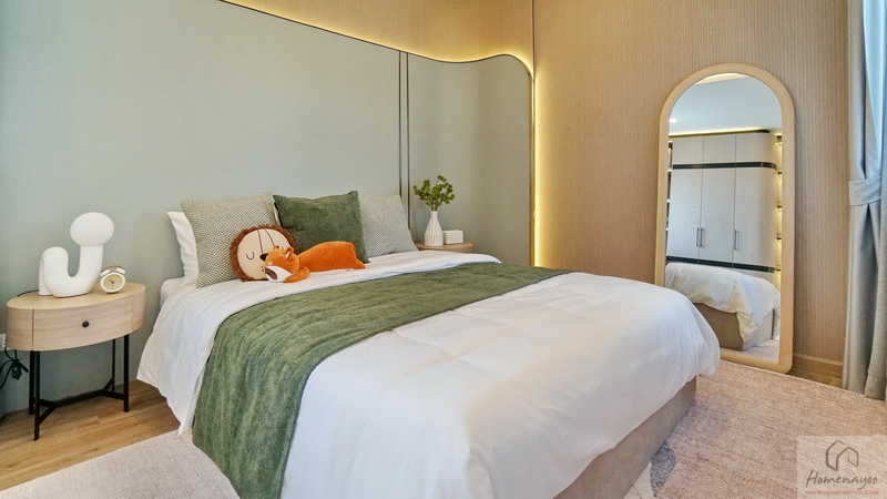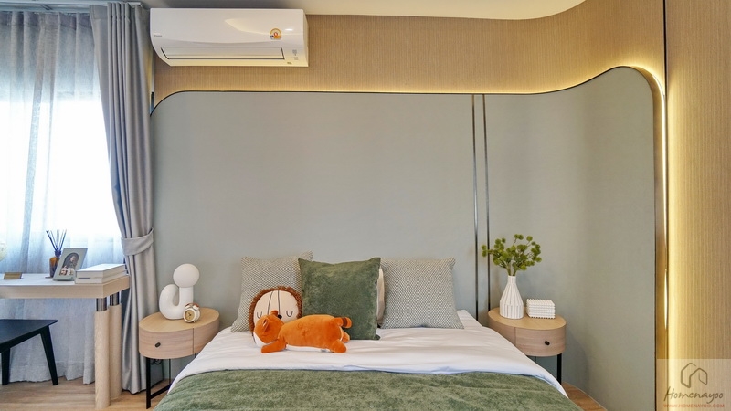 ฝั่งหัวเตียงวางโต๊ะด้านข้าง 2 ฝั่งมาให้ดูระยะการใช้งาน ด้านหลังกรุเป็นผนังลวดลายทรงสวย ๆ เพิ่ม Gimmick ให้กับตัวห้องดูไม่เรียบจนเกินไป