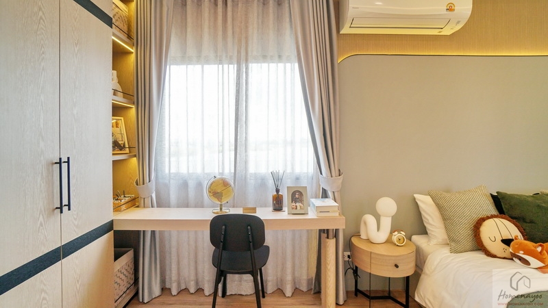 ถัดมาคือห้องนอนชั้นล่างที่ปรับฟังก์ชันได้หลากหลายตามการใช้งาน เช่น ห้องนอนผู้สูงอายุ, ห้องทำงาน, ห้องพักผ่อนดูหนัง, ห้องงานอดิเรก, ห้องออกกำลังกาย หรือห้องหนังสือ เป็นต้น หากจัดเป็นห้องนอนก็เหมาะวางเตียงนอนขนาด 3.5 ฟุต พร้อมวางเฟอร์นิเจอร์อื่น ๆ ได้อีก