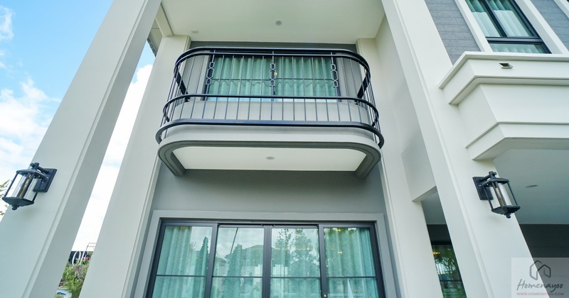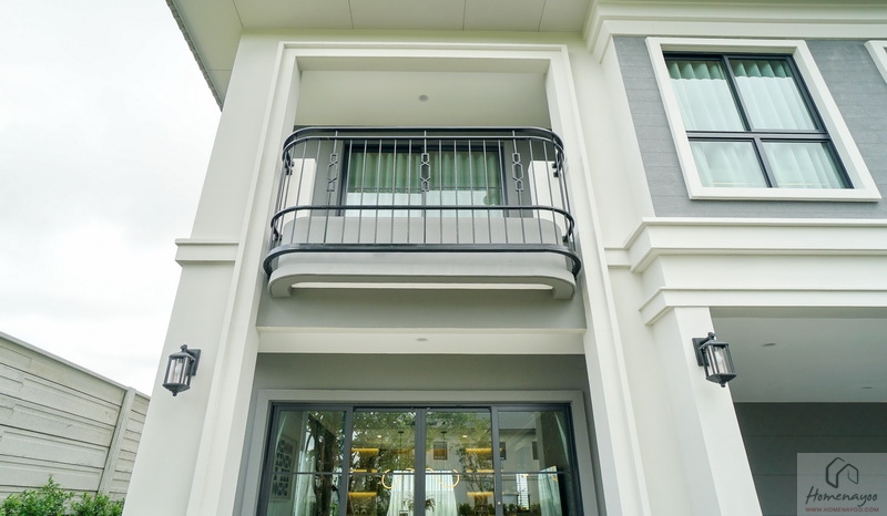 ติดราวกันตกเป็นโครงเหล็กดัดทรงโค้งทาสีดำแบบ Classic มีราวจับมาให้พร้อม ชายคาใช้บังแดดบังฝนได้ดี ติดไฟให้แสงสว่างทรงกลม 1 ดวง