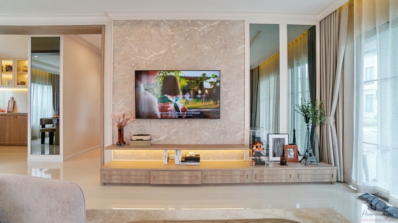 ระยะห่างจากโซฟาและชั้นวางทีวี สามารถนั่งดูทีวีจอใหญ่ได้ในระยะสบายสายตา มีพื้นที่ตรงกลางเหลือให้เดินผ่านเข้า-ออกได้อย่างคล่องตัว