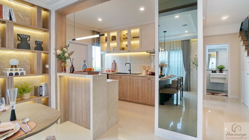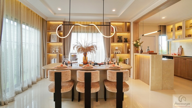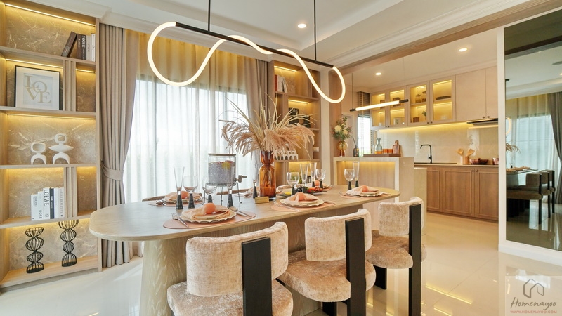 ระยะการใช้งานกว้างกำลังดีลุกนั่งสะดวก ด้านบนตกแต่งด้วยโคมไฟสวย ๆ ฝั่งหลังบ้านมีช่องแสงให้อีก 1 จุด บรรยากาศดูโปร่งสบาย รับแสงจากภายนอกเข้ามาได้เยอะ