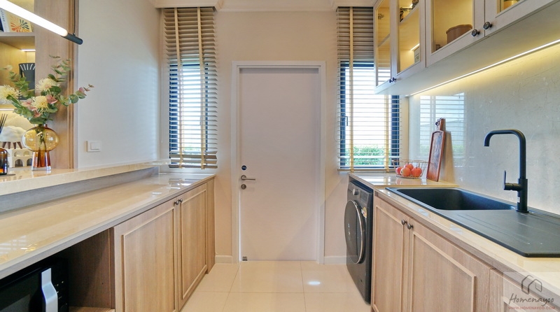 เข้าไปดูห้องครัวกันต่อเลยค่ะ โดยเป็นครัวไทยปิดกั้นเป็นสัดส่วน เวลาประกอบอาหารกลิ่นและควันจะไม่คลุ้งออกมายังโซนพักผ่อนด้านใน