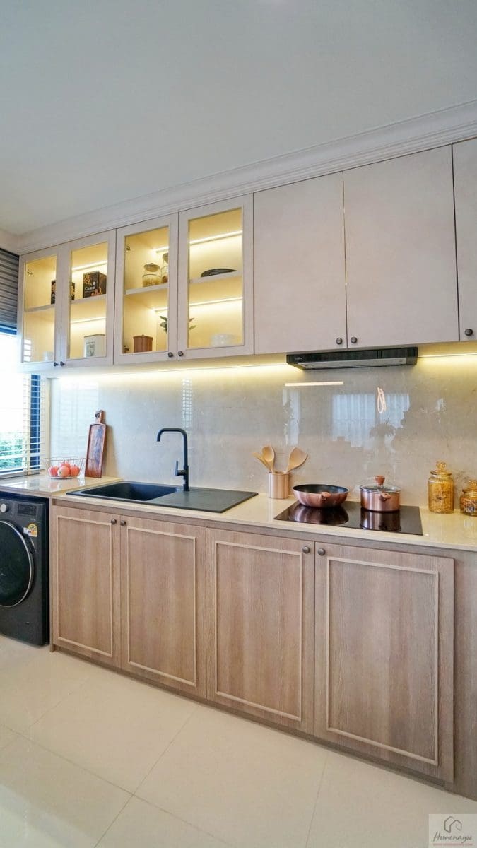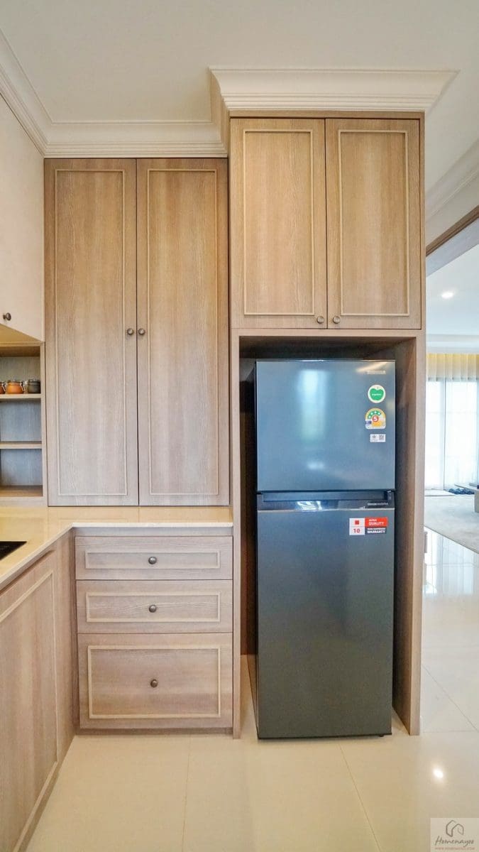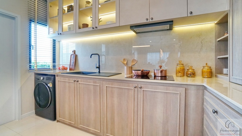 ภายในห้องครัวพื้นที่กว้างกำลังดีสามารถ Built-in เคาน์เตอร์ครัวแบบ L-Shape ได้อย่างสวยงาม ฟังก์ชันครบทั้งส่วนทำอาหาร, ฮูดดูดควัน, ส่วนเตรียมอาหาร และซิงค์ล้างจาน