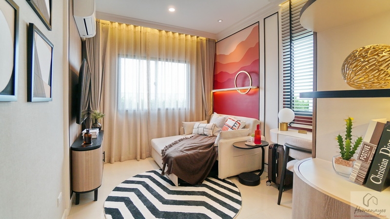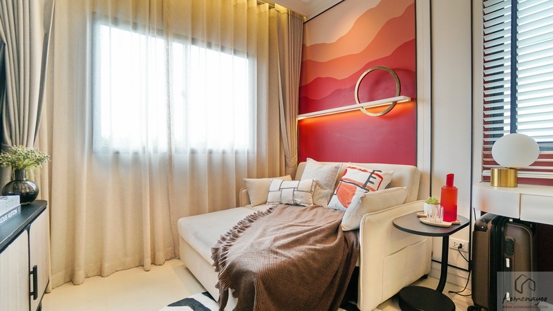 ภายในห้องขนาดกว้างกำลังดีจัดวางเฟอร์นิเจอร์มาตรฐานได้ครบชุด มีทั้งโซนพักผ่อนและห้องน้ำในตัว