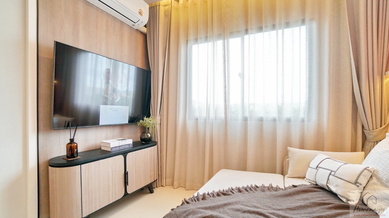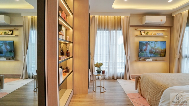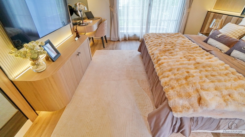 ระยะห่างจากเตียงและชั้นวางค่อนข้างกว้าง ทำให้นั่งดูทีวีจอใหญ่ได้ในระยะสบายสายตา