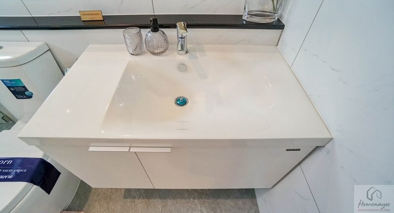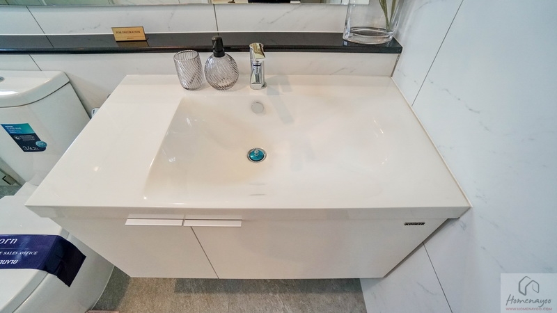 มุมอ่างล้างหน้าใช้เคาน์เตอร์ทรงเหลี่ยมด้านล่างมีช่องเก็บของบานปิด หน้าอ่างวางของใช้ได้เยอะพอสมควร