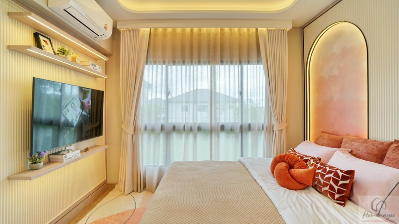ฝั่งปลายเตียงผนังกว้างกำลังดีเหมาะติดตั้งทีวีไว้ที่ผนัง มีช่องรับแสงธรรมชาติให้ 1 บาน ใกล้กันคือห้องน้ำในตัวเพิ่มความสะดวกสบาย