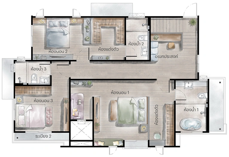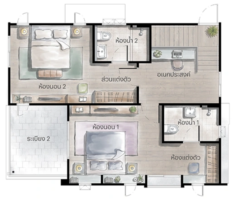 แปลนบ้านชั้น 2 : ขึ้นมาจะเจอโถงทางเดินแนวยาวใช้เชื่อมไปยังส่วนต่าง ๆ ติดกับบันไดคือพื้นที่อเนกประสงค์ปรับฟังก์ชันได้ตามการใช้งาน ฝั่งหน้าบ้านคือ Master Bedroom ห้องหน้ากว้างฟังก์ชันครบทั้งโซน Walk-in Closet, ระเบียง และห้องน้ำในตัว ฝั่งซ้ายของแปลนคือห้องนอน 3 ส่วนหลังบ้านจะเป็นห้องนอน 2 โดยทุกห้องมีห้องน้ำในตัวเพิ่มความสะดวกสบาย