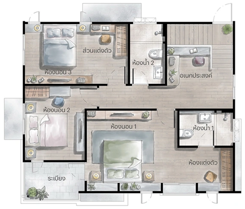 ออกมาดูห้องนอนรองกันบ้าง ตรงกลางที่เห็นคือห้องนอน 3 ส่วนฝั่งหลังบ้านจะเป็นห้องนอน 2 ทุกห้องมาพร้อมห้องน้ำในตัวเพิ่มความสะดวกให้กับสมาชิกภายในบ้าน