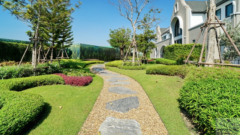ลัดมาที่หลังบ้านพื้นที่ใช้งานกว้างกำลังดี บ้านตัวอย่างลงพุ่มไม้ดอกไม้และไม้ริมรั้วตลอดแนวกำแพง พื้นเทหินกรวดตลอดทางเดิน จุดที่ยื่นออกมาจากตัวบ้านคือ Bay Window พื้นที่รับแสงและพักผ่อนภายในบ้าน