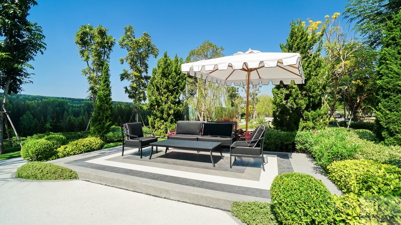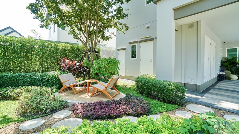 มุมมองสวนข้างบ้านทางฝั่งซ้ายสามารถเดินเชื่อมไปส่วนหลังบ้านรวมถึงรอบตัวบ้านได้ทั้งหมด บ้านตัวอย่างจัดมุมนั่งพักผ่อนท่ามกลางบรรยากาศธรรมชาติให้ดูเป็นไอเดีย ถัดเข้าไปเล็กน้อยจะเจอประตูเชื่อมเข้าไปยังครัวไทยภายในบ้าน