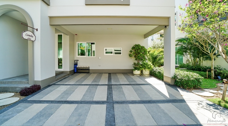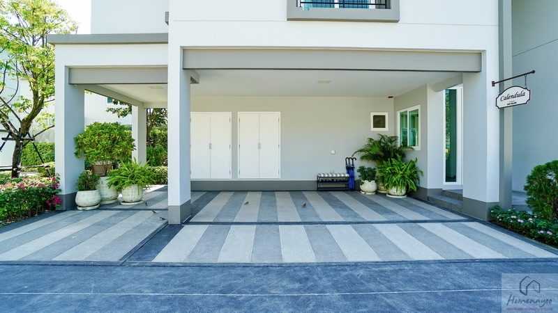 โรงจอดรถกว้างจอดได้ 3 คัน ด้านในโครงสร้าง On Beam แบบเดียวกับตัวบ้าน ส่วนนอกชายคาโครงสร้าง On Ground ลงเข็มปูพรมลึก 6 ม. บ้านมาตรฐานจะเป็นพื้นเทคอนกรีตปาดเรียบ ส่วนของบ้านตัวอย่างทำผิวทรายล้างให้ดูเป็นไอเดีย ฝ้าชายคาติดไฟ LED ทรงเหลี่ยมขนาดใหญ่ 2 ดวง ด้านในเตรียม Junction Box รองรับ EV Charger และปลั๊กไฟพร้อมฝาครอบกันน้ำไว้ให้