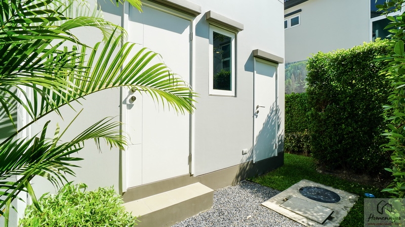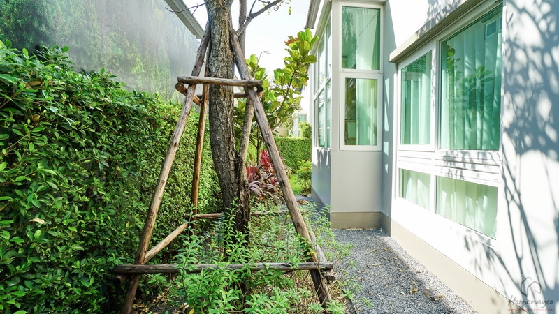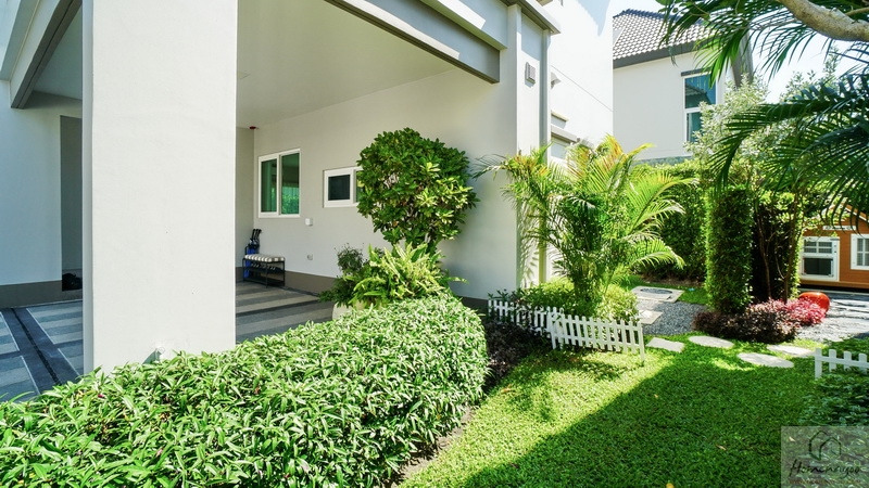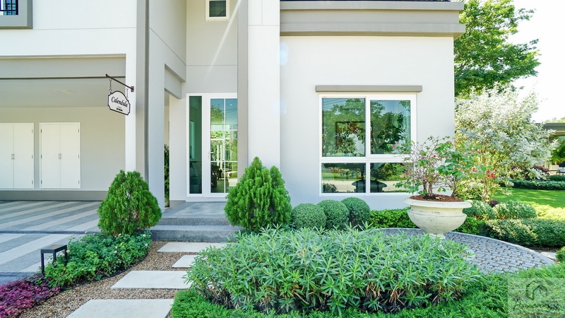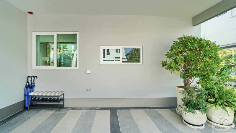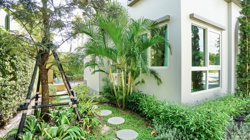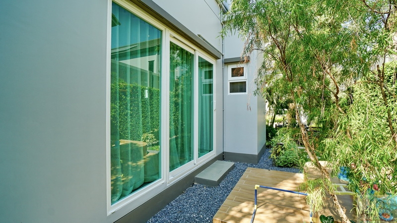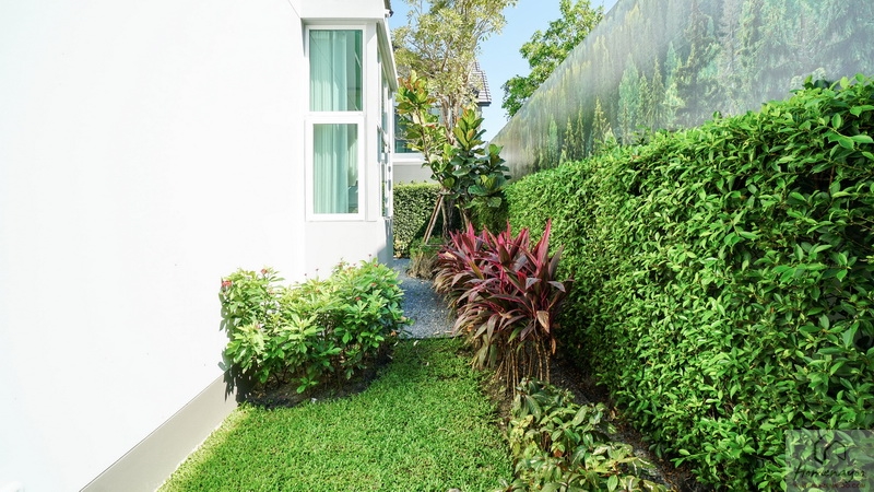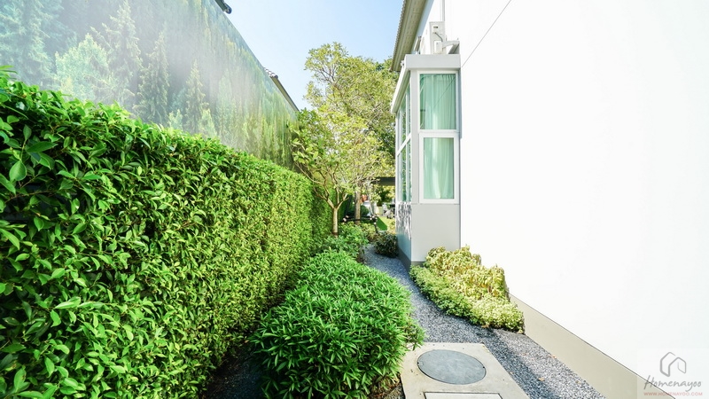 ส่วนข้างตัวบ้านทางฝั่งขวาจัดเป็นสวนหย่อมได้โดยรอบ มีประตูกระจกบานเลื่อนขนาดใหญ่เปิดเชื่อมเข้าไปยัง Living Area ภายในบ้านได้