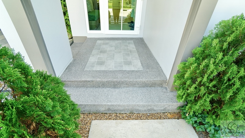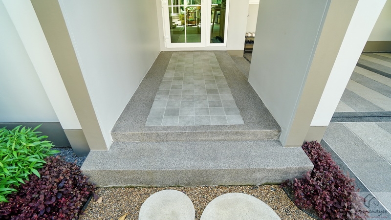มาดูบริเวณประตูทางเข้าหลักกันต่อ เฉลียงบ้านกว้างยกพื้นขึ้นมา 2 Step ช่วยป้องกันสิ่งสกปรก, แมลงตัวเล็ก ๆ หรือฝุ่นผงได้ดี พื้นปูกระเบื้องลวดลายสวยงามผสมกับพื้นทรายล้างโทนสีเทา ด้านบนมีหลังคาช่วยกันแดดกันฝนโดยออกแบบเชื่อมไปยังโรงจอดรถ