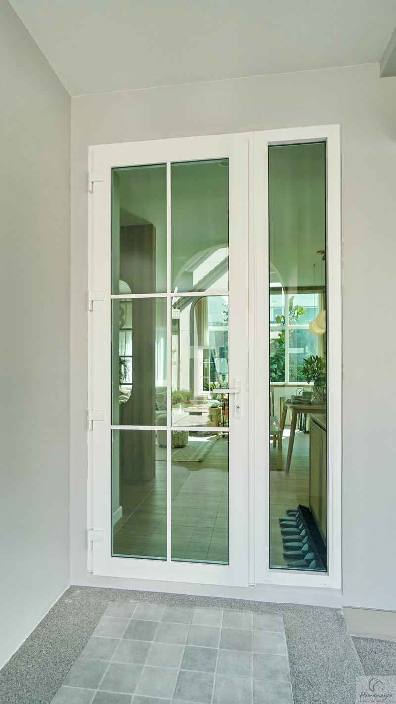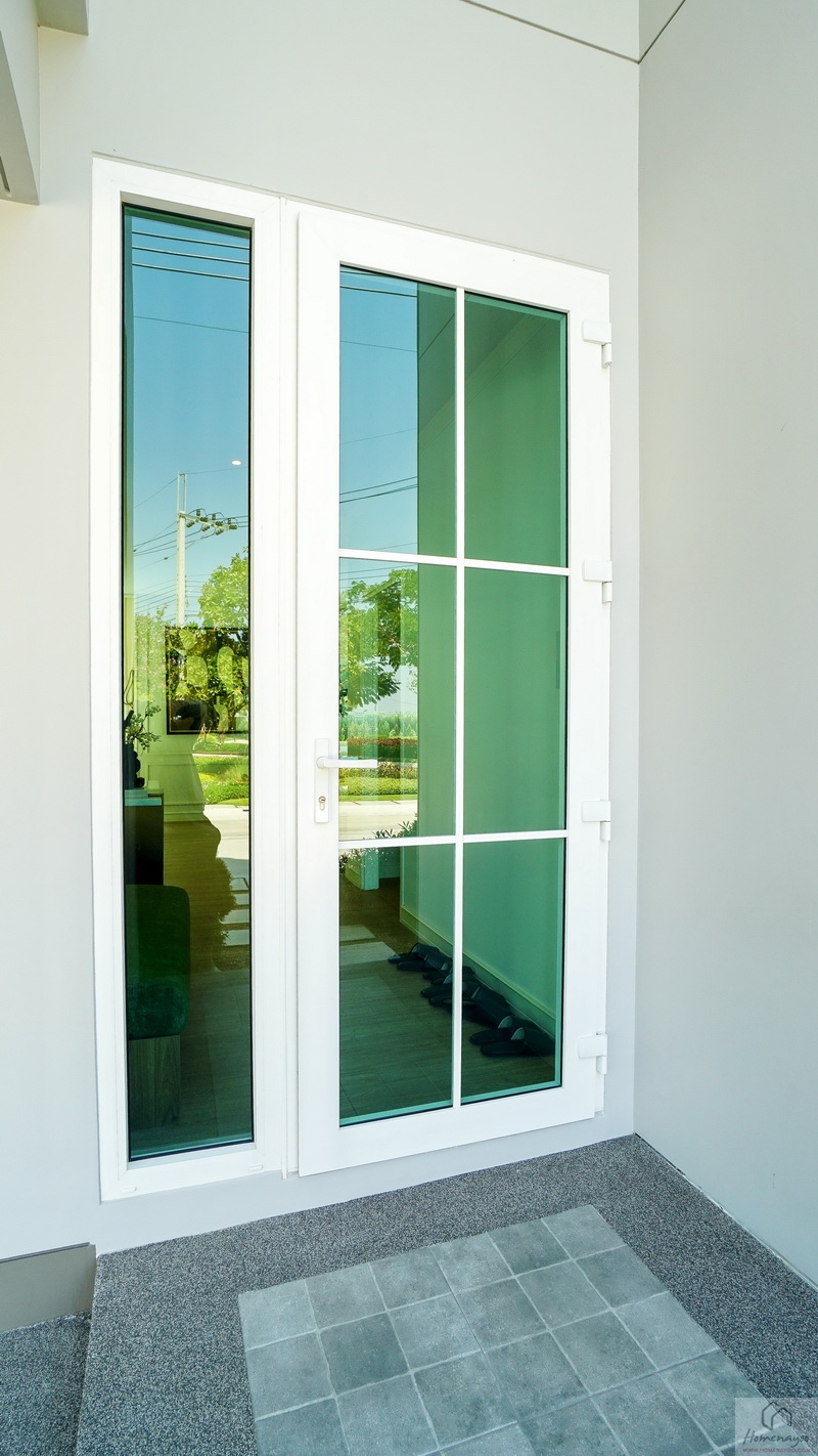 ประตูบ้านใช้เป็นบานเปิดกระจกเขียวตัดแสงลายตารางลูกฟักกรอบ UPVC สีขาว ด้านข้างมีช่องแสงบานฟิกซ์เพิ่มความโปร่ง โล่ง ให้กับตัวบ้านได้ดี