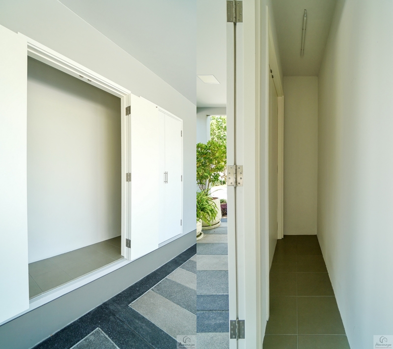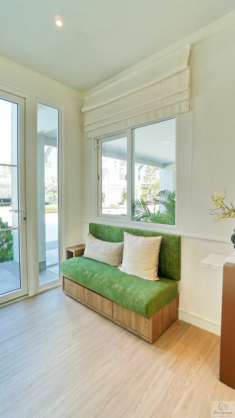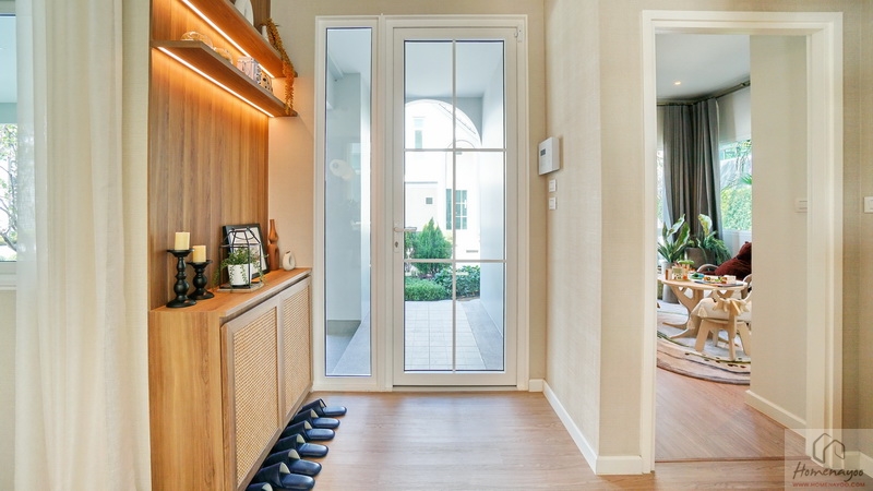 พร้อมเพิ่มพื้นที่ใช้สอยจัดเป็นมุมพักคอยให้ดูเป็นไอเดีย จุดนี้ใช้งานอเนกประสงค์ได้เลย เช่น ตั้งชั้นวางรองเท้า, ที่เก็บร่ม, กระเป๋า, หมวก, หรือโต๊ะวางของเล็ก ๆ ผนังด้านข้างมีหน้าต่างกระจกบานเลื่อนขนาดใหญ่มาให้ 1 ชุด บวกกับช่องแสงบริเวณประตูทำให้บ้านดูโปร่งมากยิ่งขึ้น