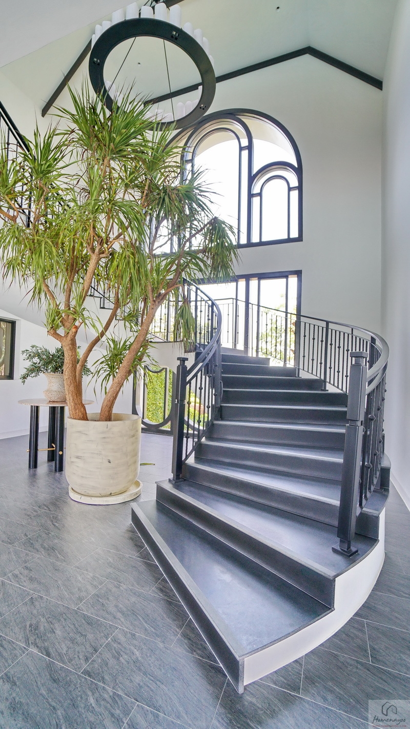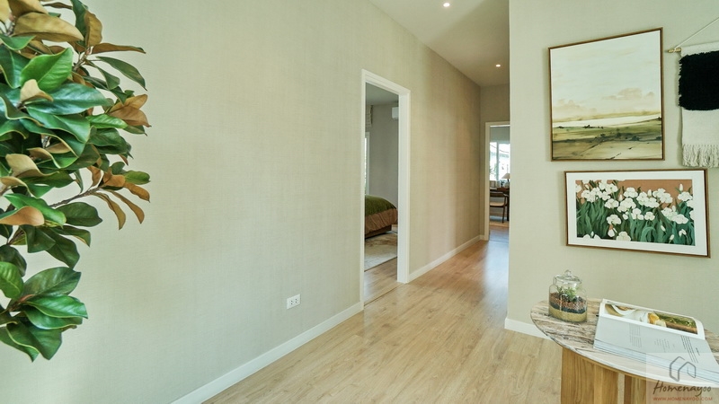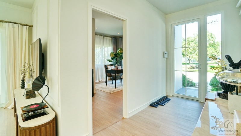 เปิดประตูเข้ามาภายในบ้านจะเจอ Foyer ขนาดกว้างออกแบบให้มีความเป็นส่วนตัว ชั้นล่างฝ้าเพดานสูง 2.7 ม. ปูพื้น SPC ลายไม้ ผนังบ้านฉาบเรียบทาสี ใช้หลอด LED ช่วยประหยัดพลังงานทั้งหลัง