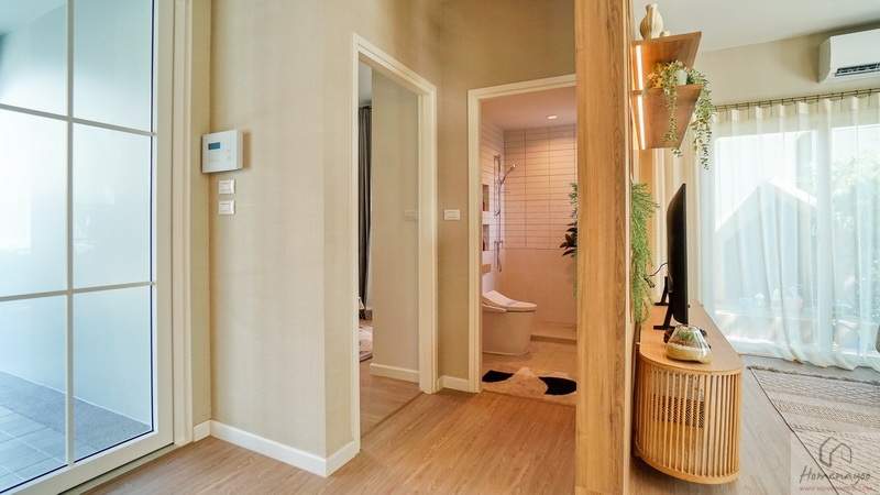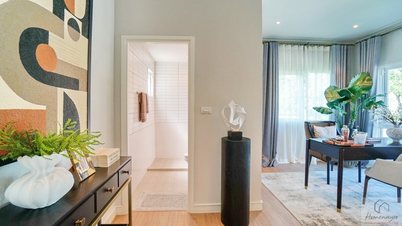หลังเปิดประตูเข้ามาฝั่งขวาหน้าบ้านจะเจอห้องนอนชั้นล่างมีห้องน้ำในตัว ที่รองรับความยืดหยุ่นในอนาคตรวมถึงเหมาะจัดเป็นห้องนอนผู้สูงอายุด้วยค่ะ