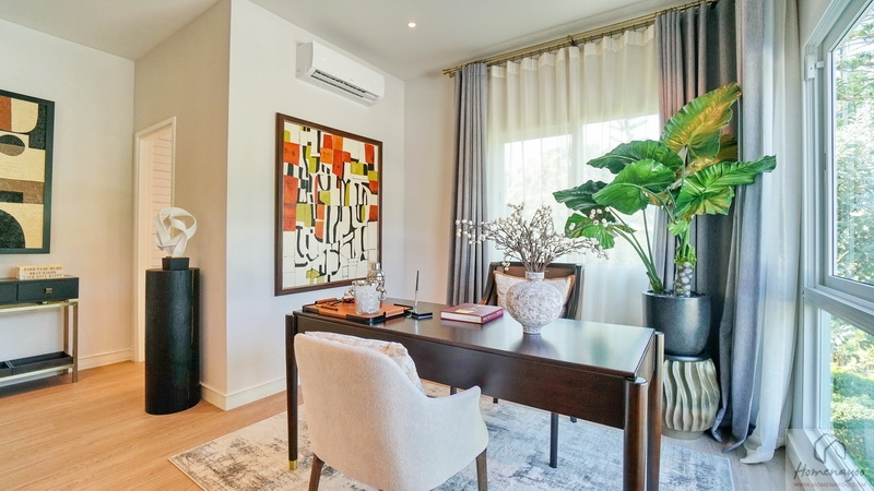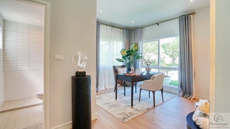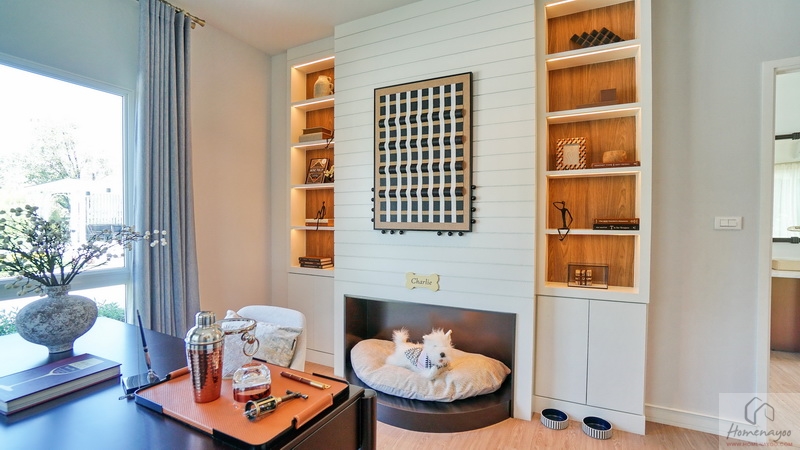 สำหรับบ้านตัวอย่างจัดเป็นห้องทำงานที่มีมุมสำหรับสัตว์เลี้ยงให้ดูเป็นไอเดีย แต่หากจะจัดเป็นห้องนอนก็เหมาะวางเตียงขนาด Queen Size ได้เลย พร้อมจัดเฟอร์นิเจอร์อื่น ๆ ได้อีก