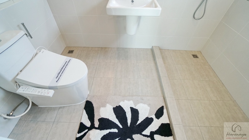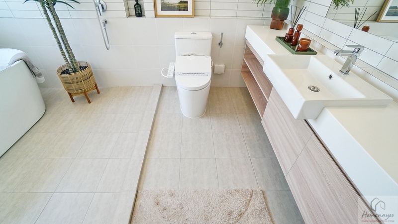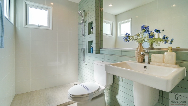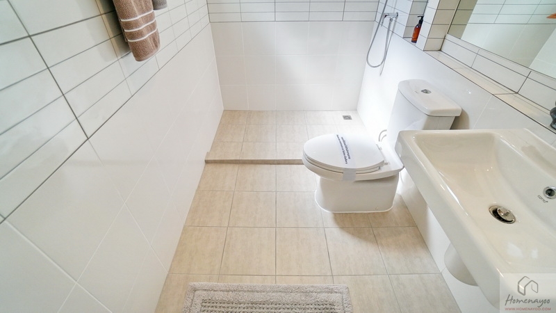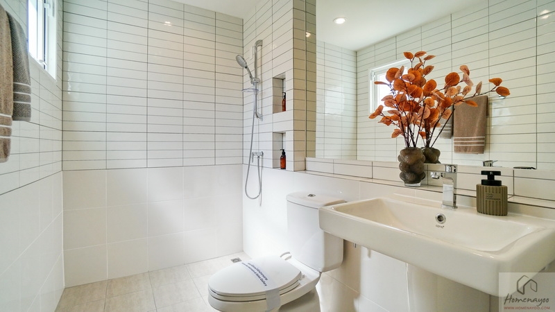 ขณะที่ห้องน้ำในตัวของ Master Bedroom ขนาดค่อนข้างใหญ่ทีเดียว สุขภัณฑ์มาตรฐานใช้ของ COTTO หรือเทียบเท่า ตกแต่งพื้นและผนังด้วยกระเบื้องโทนสีสะอาดตา แบ่งโซนแห้ง-เปียกไว้ชัดเจน