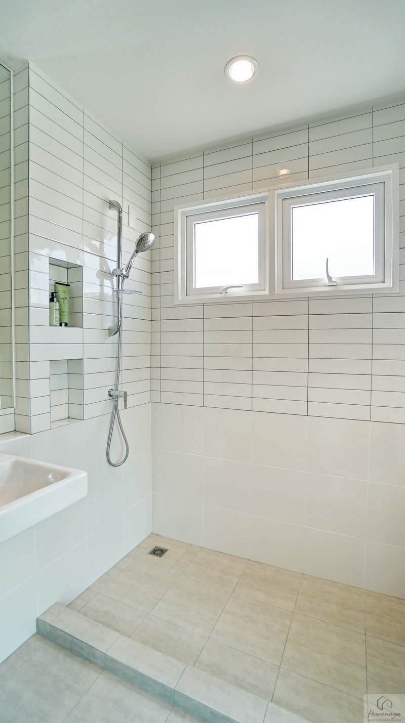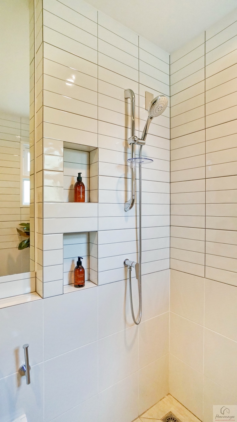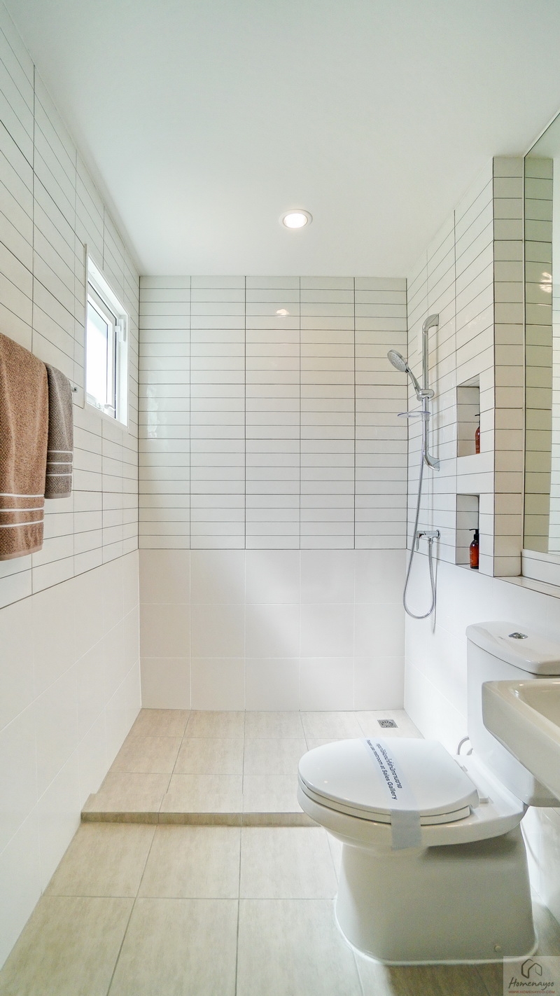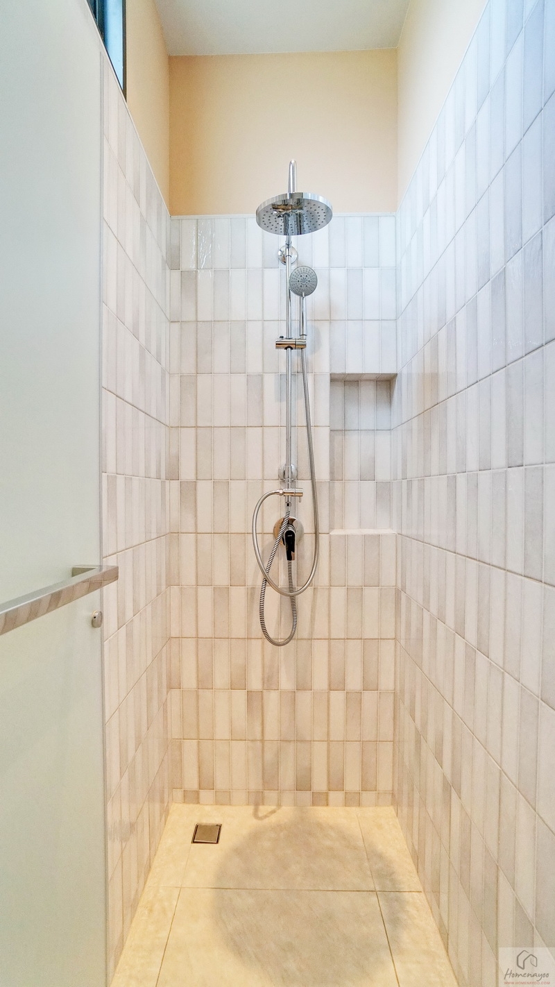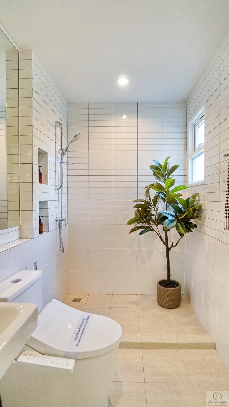มุมอาบน้ำแยกส่วนแห้ง-ส่วนเปียกด้วยขอบธรณี ด้านในใช้ฝักบัว Hand Shower มีราวปรับระดับสูง-ต่ำ ด้านข้างเจาะผนังทำเป็นที่วางของใช้ให้ 2 Step บนผนังเดินงานระบบไฟฟ้าติด Junction Box รองรับการติดตั้งเครื่องทำน้ำอุ่นมาให้เรียบร้อย พร้อมหน้าต่างกระจกฝ้าบานกระทุ้งช่วยระบายอากาศให้ 1 ชุด