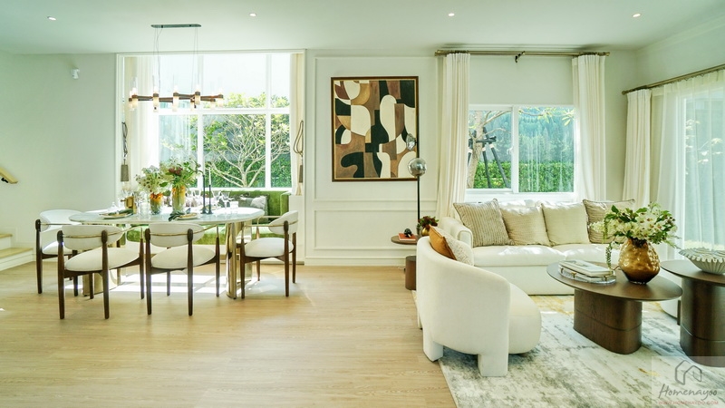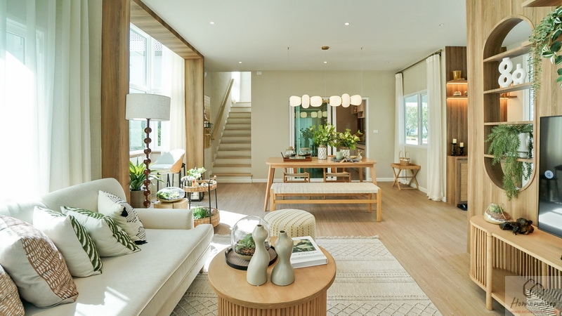 ถัดเข้าไปคือพื้นที่หน้ากว้างแบบ Open Plan เชื่อมต่อฟังก์ชันถึงกันได้ทุกส่วน รวม Living & Dining Area เข้าไว้ด้วยกันอย่างลงตัว