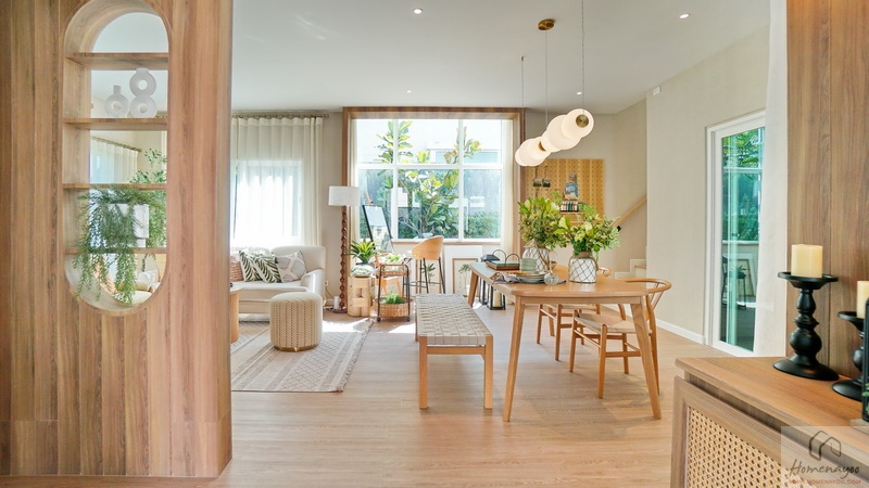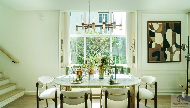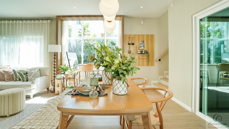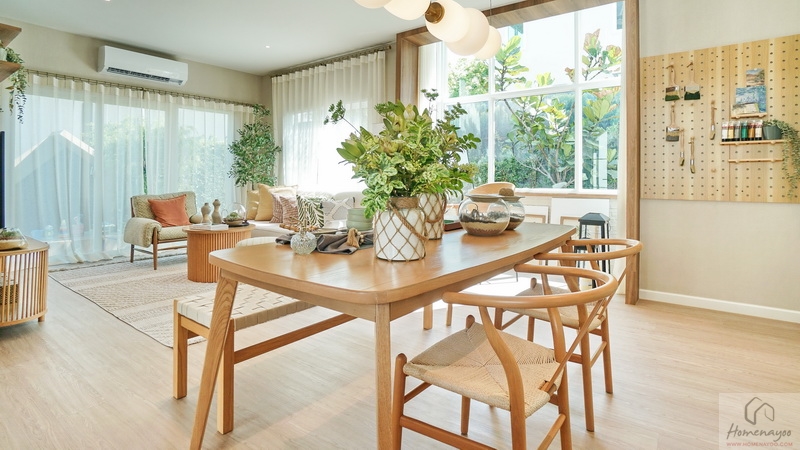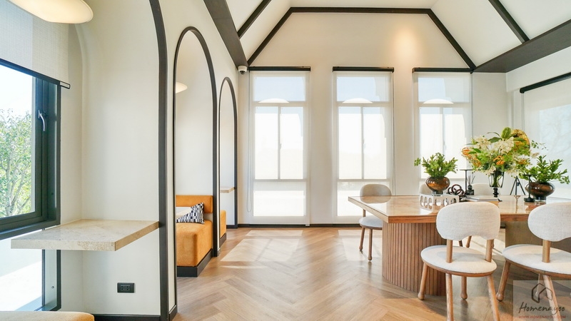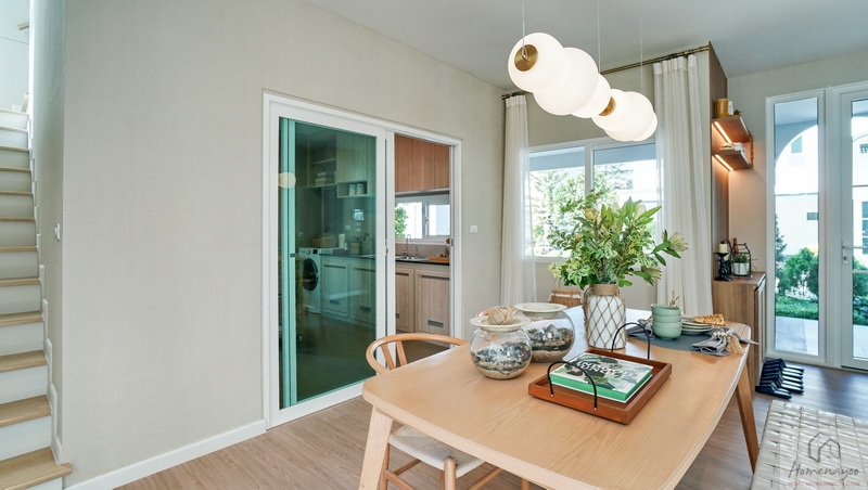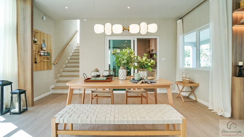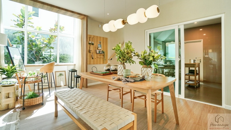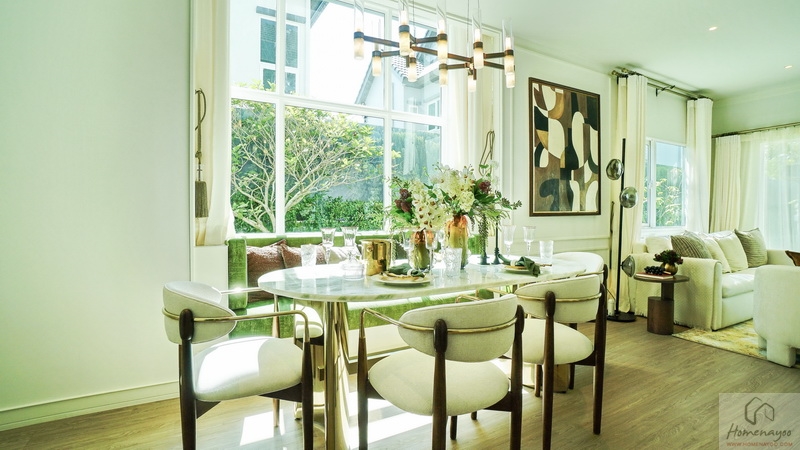 ต่อเนื่องเยื้องกันทางซ้ายคือ Dining Area ที่บ้านตัวอย่างจัดไว้ช่วง Bay Window อย่างสวยงาม เพิ่มพื้นที่รับแสงธรรมชาติให้กับตัวบ้านได้ดี จัดวางชุดโต๊ะรับประทานอาหารขนาด 4-6 ที่นั่งได้สบาย ๆ