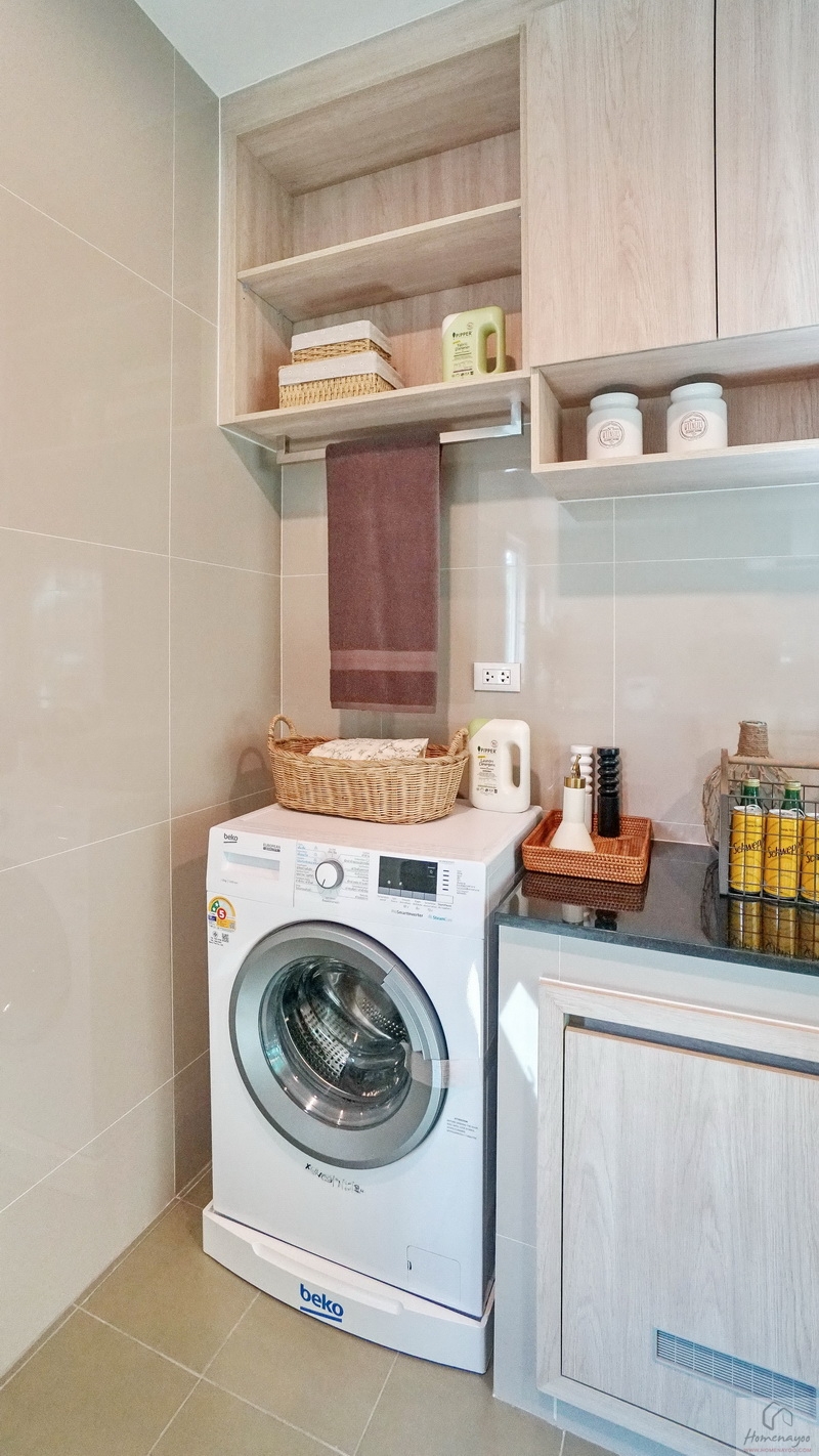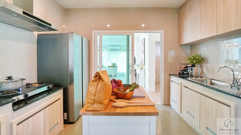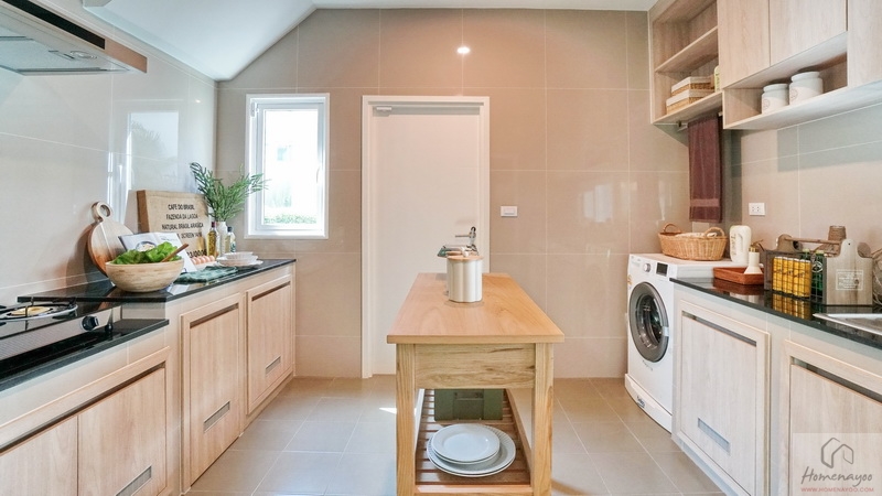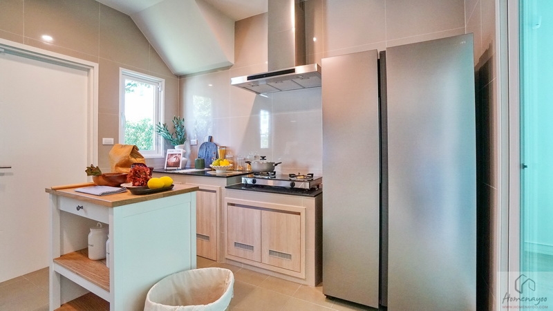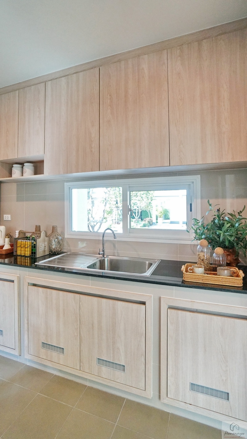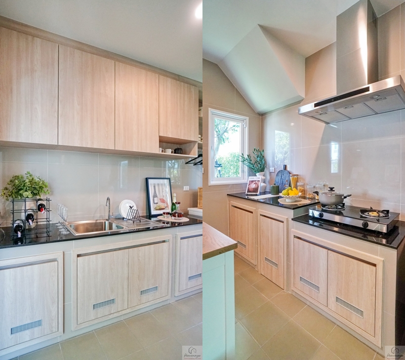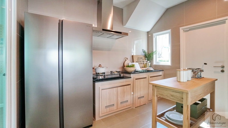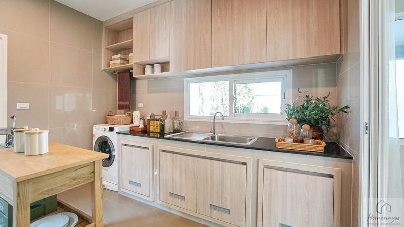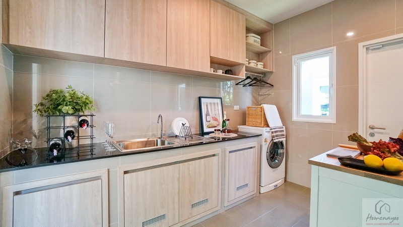 บ้านมาตรฐานทางโครงการ Built-in เป็นเคาน์เตอร์ครัวปูนไว้ให้ทั้ง 2 ฝั่งของห้อง ท็อปด้วยหินสังเคราะห์สีเข้มทำความสะอาดได้ง่าย มีตู้เก็บของบานปิดลายไม้พร้อมช่องระบายอากาศที่ด้านล่าง ติดกับเคาน์เตอร์จะมีพื้นที่เหลือให้วางตู้เย็นหรือเครื่องซักผ้าได้ทั้ง 2 ฝั่ง ตรงกลางบ้านตัวอย่างวาง Island ครัวให้ดูระยะการใช้งาน