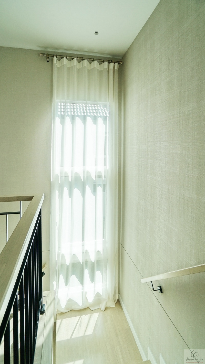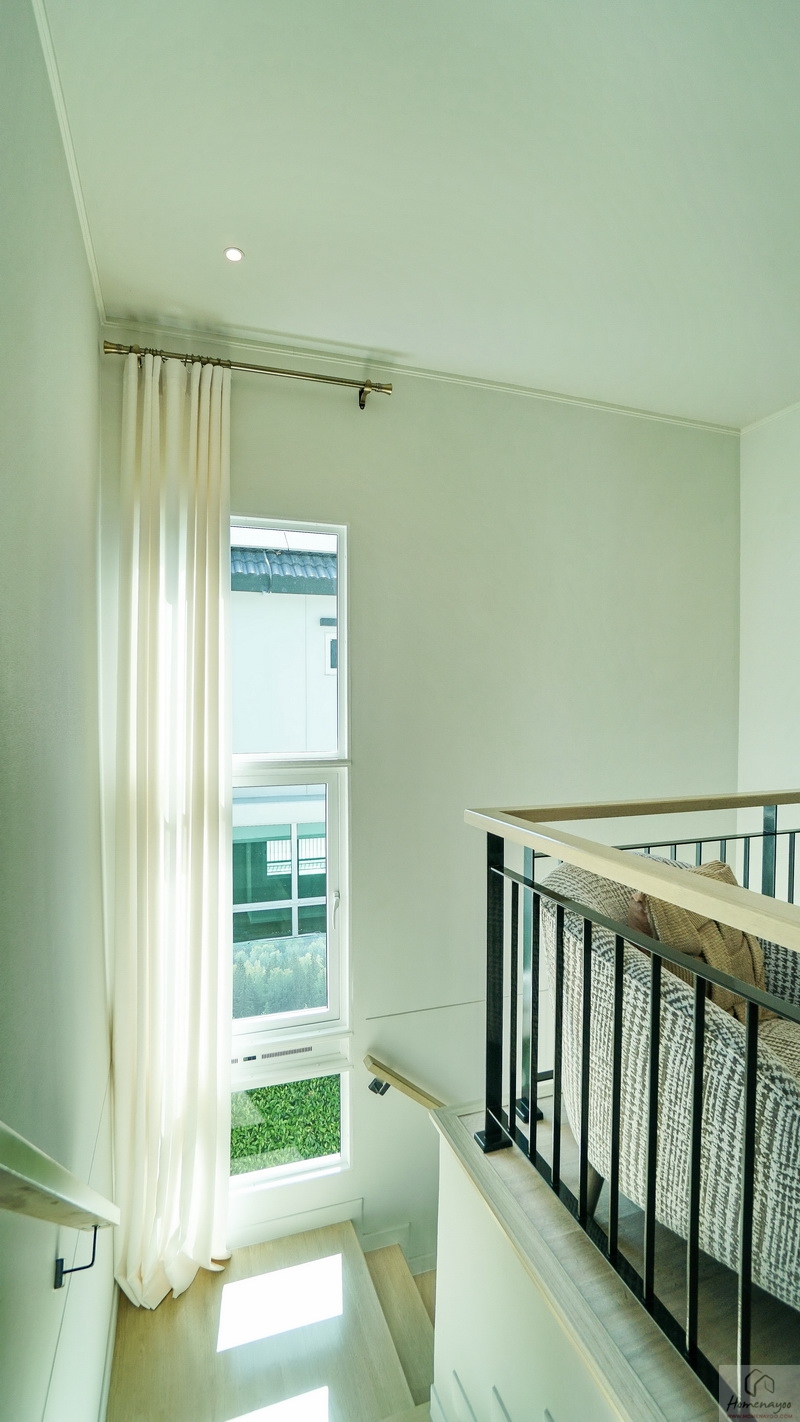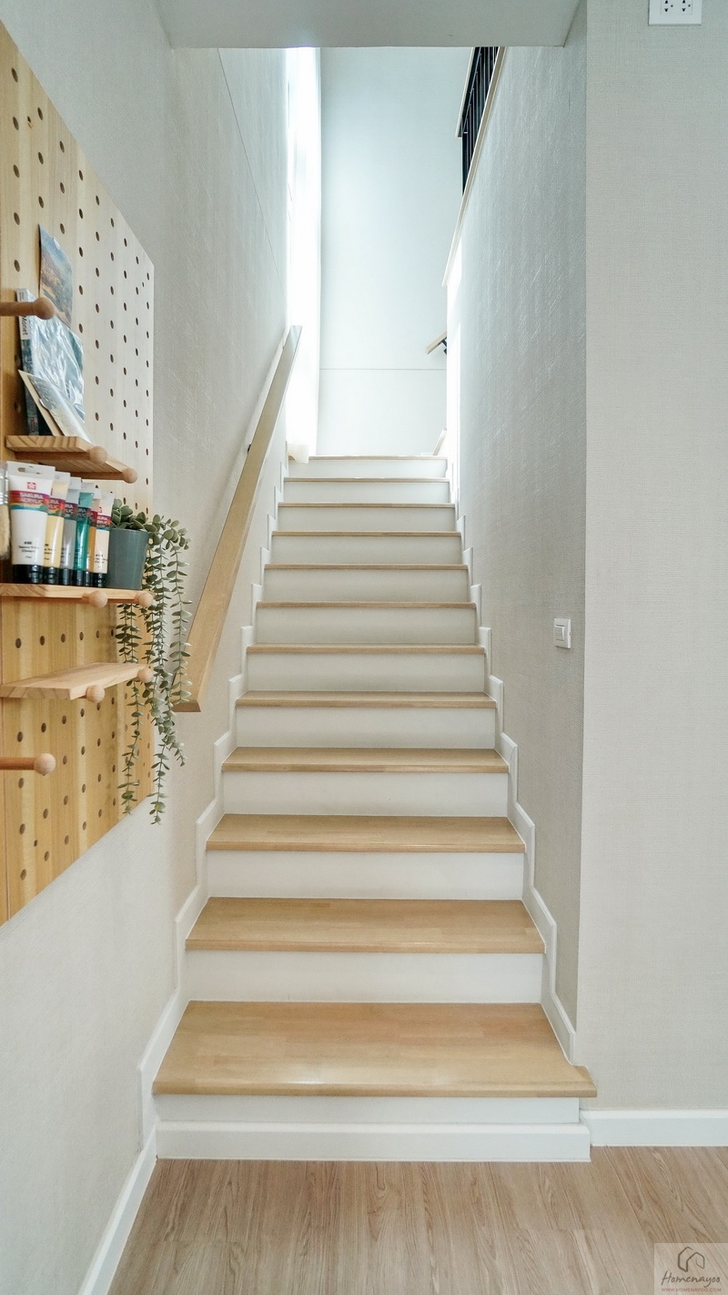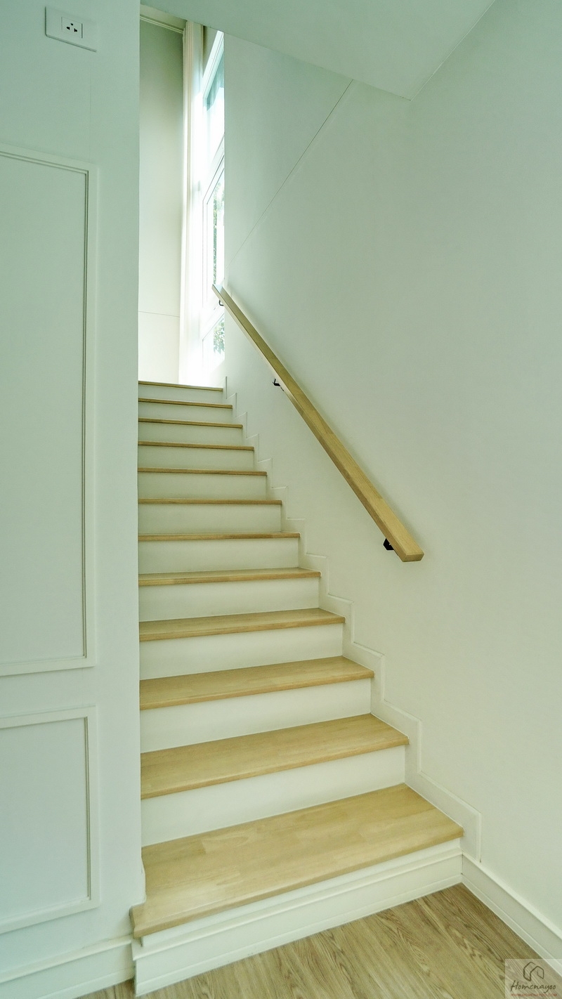 เดี๋ยวเราขึ้นไปดูชั้น 2 ของบ้านกันต่อ โดยบันไดบ้านจะอยู่ใกล้กับห้องครัวและ Dining Area มีราวจับบันไดแบบฝังผนังมือจับใช้ไม้ชนิดเดียวกับลูกนอนยาวต่อเนื่องขึ้นไปจนถึงชั้นบน