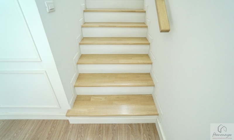 บันไดบ้านโครงสร้างคอนกรีตเสริมเหล็กแข็งแรงทนทาน เดินขึ้น-ลงเสียงจะไม่ดัง ลูกนอนปิดผิวด้วยไม้ยางพาราอัดประสานสำเร็จรูป ลูกตั้งฉาบเรียบทาสีขาว