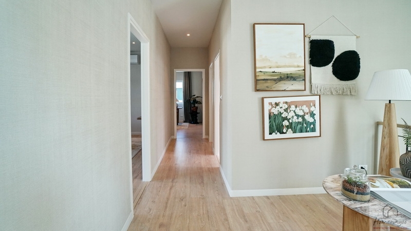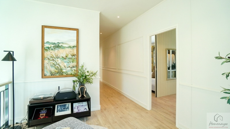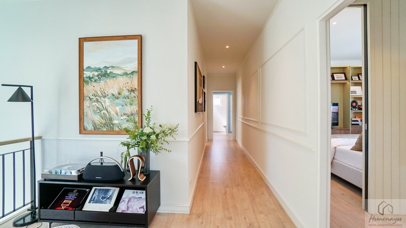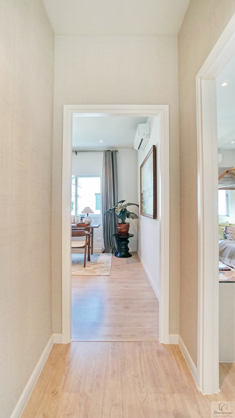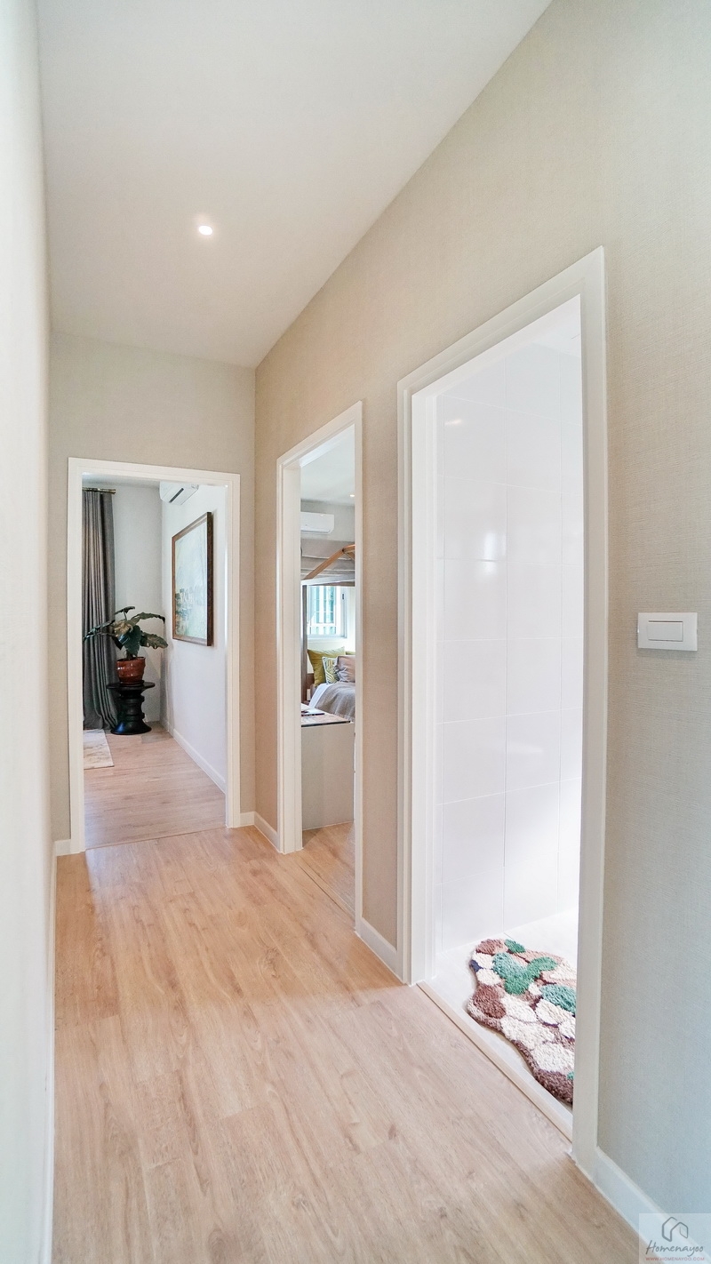 ขึ้นมาชั้น 2 ของตัวบ้านจะเจอโถงทางเดินแนวยาวเชื่อมไปยังส่วนต่าง ๆ เพดานสูง 2.7 ม. ปูพื้นลามิเนตลายไม้เพิ่มความอบอุ่นให้กับตัวบ้านได้ดี