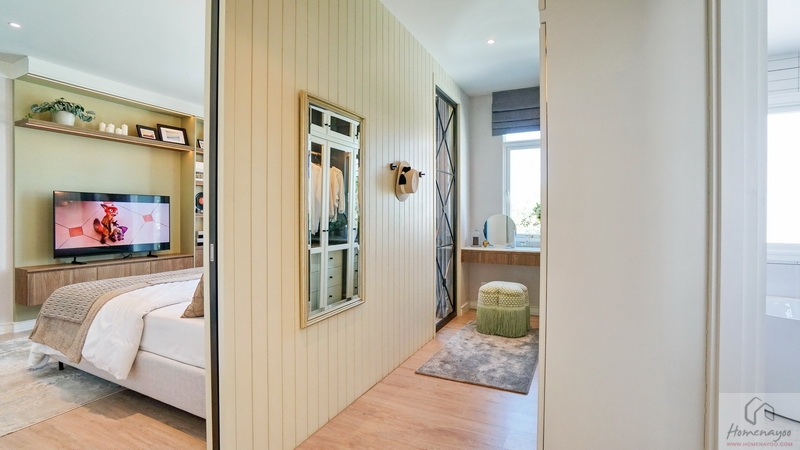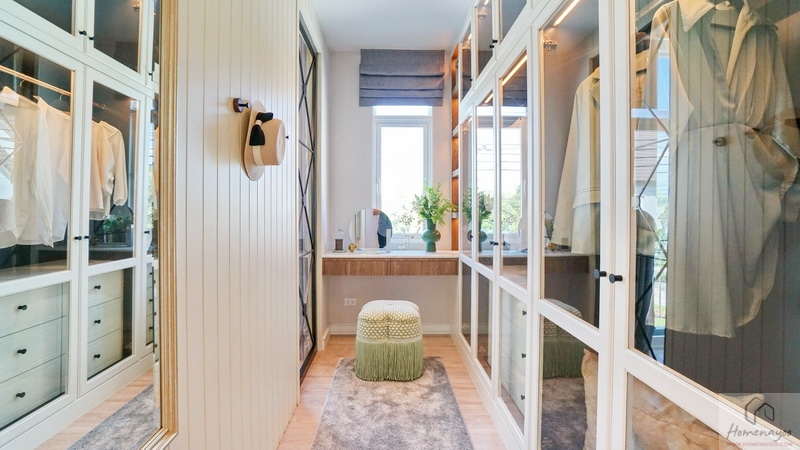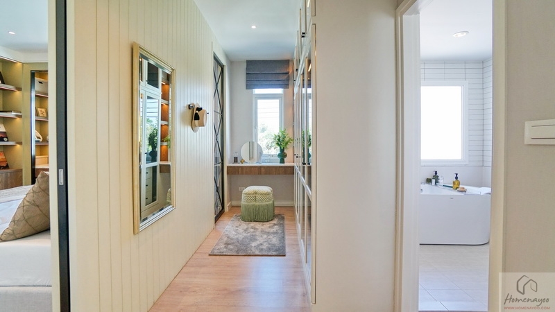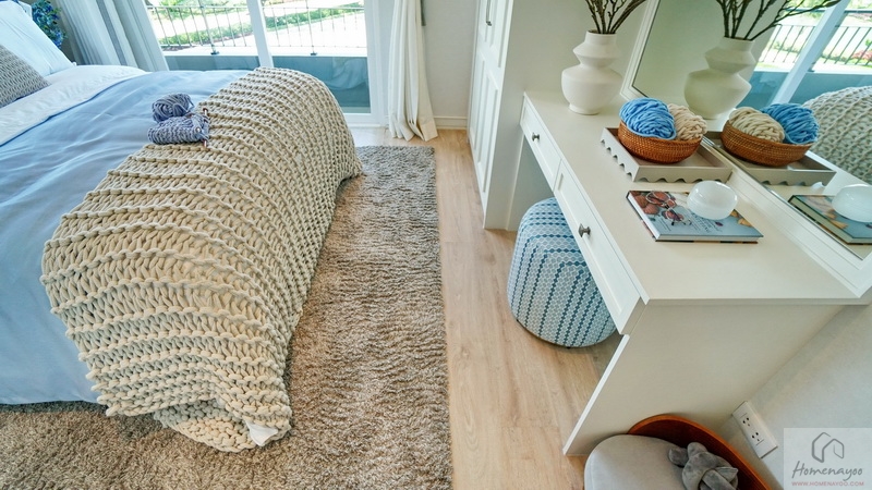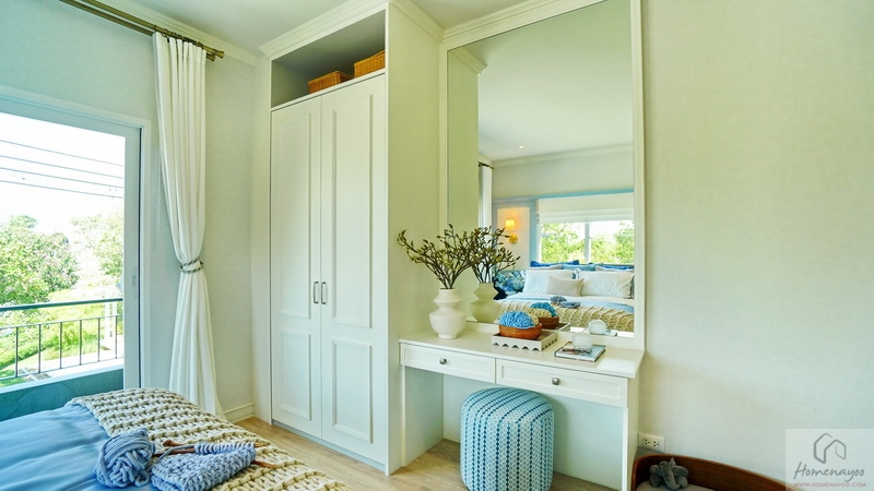 ฝั่งปลายเตียงผนังกว้างบ้านตัวอย่าง Built-in เป็นมุมโต๊ะเครื่องแป้งและตู้เสื้อผ้าให้ดูเป็นไอเดีย