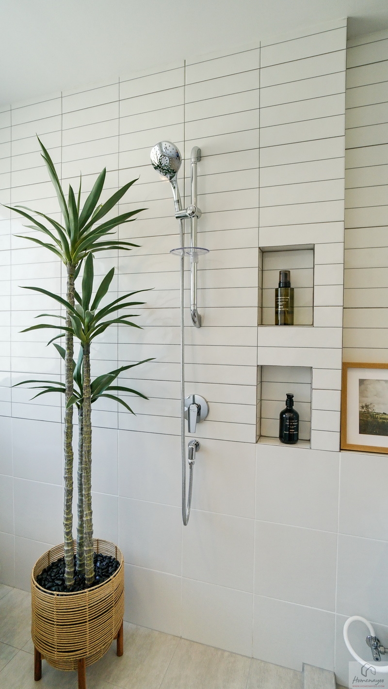 ใกล้กันคือมุมอาบน้ำใช้ฝักบัว Hand Shower มีราวปรับระดับสูง-ต่ำ ด้านข้างเจาะผนังเป็นที่วางของใช้ให้ 2 Step
