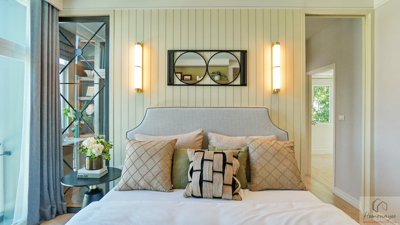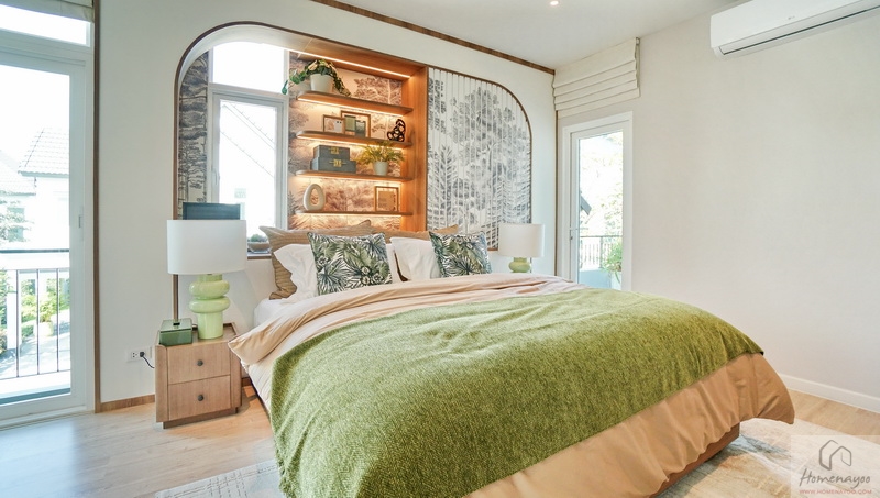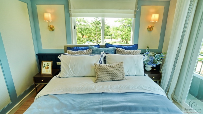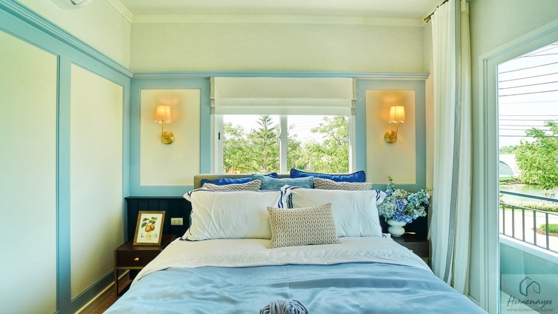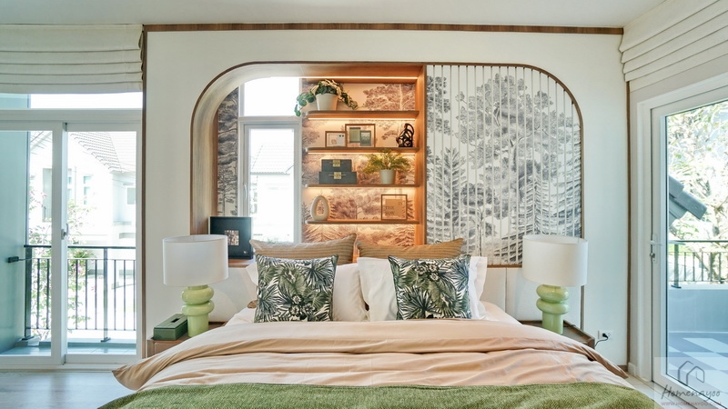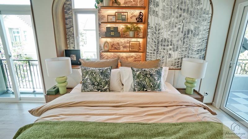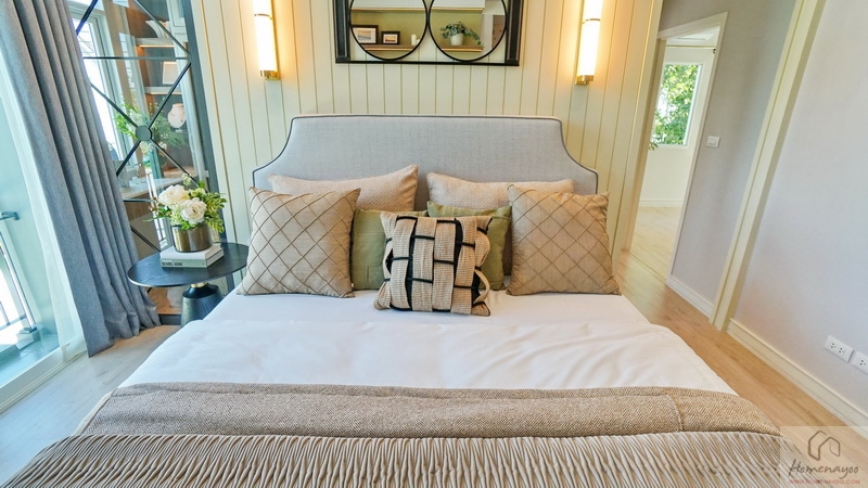 ฝั่งหัวเตียงวางโต๊ะด้านข้างไว้ 1 ฝั่ง บ้านตัวอย่างตกแต่งผนังเพิ่มพร้อมกรุ Headboard สวย ๆ