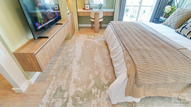 เข้ามาภายในเป็นห้องหน้ากว้างได้พื้นที่ใช้งานฝั่งนี้ทั้งหมด แบ่งฟังก์ชันไว้เป็นสัดส่วนมีครบทั้งโซนพักผ่อนสำหรับวางเตียงนอน, ระเบียงชมวิว, โซน Walk-in Closet และห้องน้ำในตัว