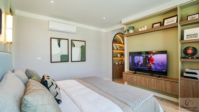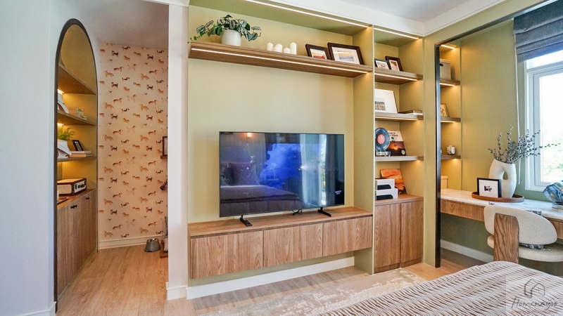 ส่วนฝั่งปลายเตียงผนังค่อนข้างกว้างจะ Built-in เป็นชั้นวางแบบลอยตัวแล้วแขวน Smart TV ไว้ที่ผนัง ด้านข้างวางตู้เก็บของเหมือนบ้านตัวอย่างก็ได้