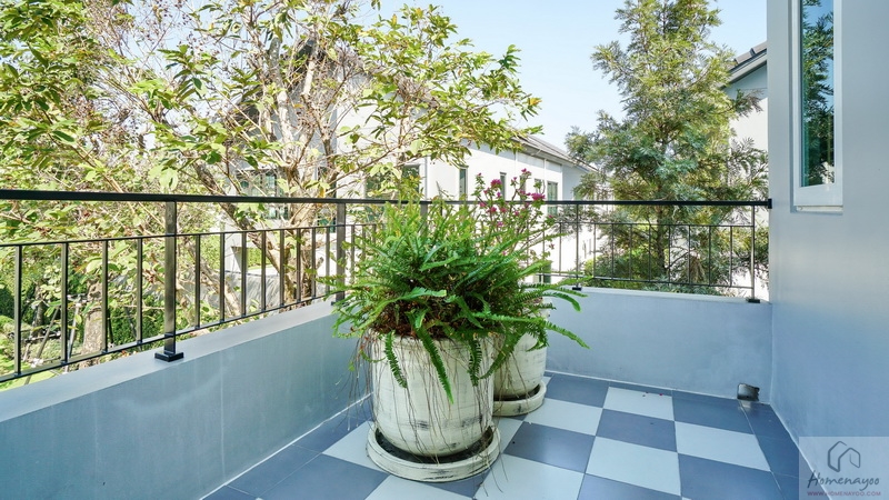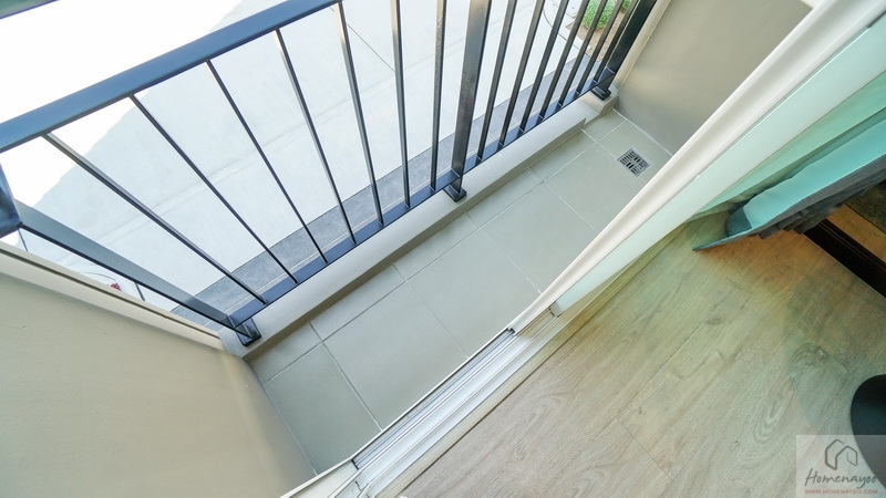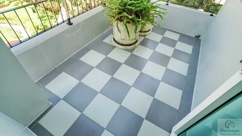 ระเบียงพื้นปูกระเบื้องสวยงามสีเทา ติดราวกันตกเป็นซี่เหล็กโปร่งทาสีดำมาให้ พื้นที่ใช้งานค่อนข้างจำกัดเหมาะเปิดช่วยระบายอากาศหรือจัด Pocket Garden เสริมบรรยากาศธรรมชาติให้กับตัวบ้านได้