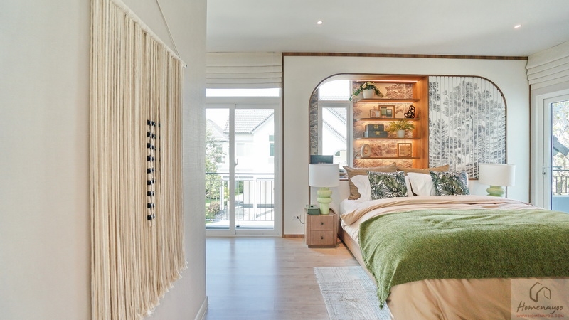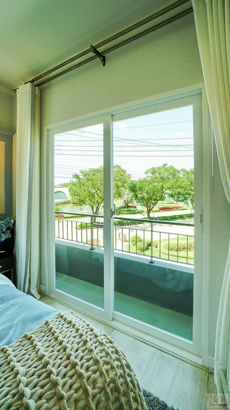 ข้างเตียงฝั่งหน้าบ้านได้ช่องแสงบานใหญ่เป็นประตูกระจกบานเลื่อนผสมบานฟิกซ์ที่เปิดออกไปยังระเบียงชมวิวด้านนอก รวมถึงบานกระทุ้งผสมบานฟิกซ์อีก 1 ชุด