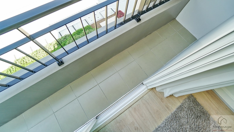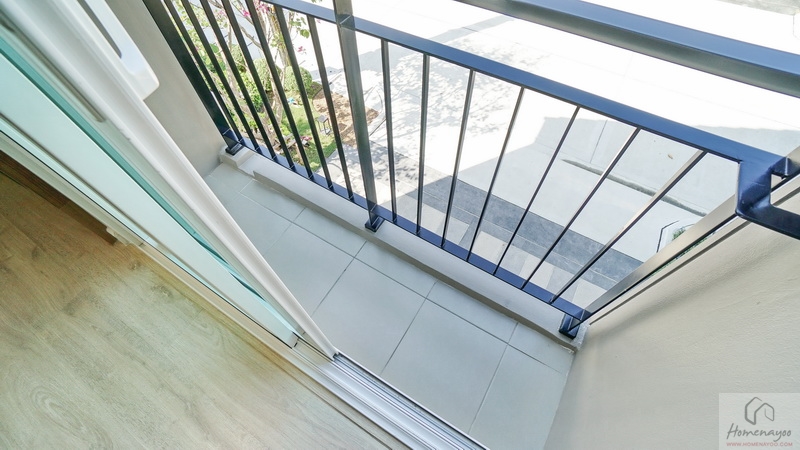 ประตูบานเลื่อนยกสูงขึ้นมาเล็กน้อยจากพื้นระเบียง ช่วยป้องกันฝุ่น, ความชื้น และสิ่งสกปรกต่าง ๆ พัดเข้าสู่ด้านในห้อง พื้นปูกระเบื้องสีเทาสวยงาม พื้นที่ใช้งานค่อนข้างจำกัดนิดหน่อย ติดราวกันตกเป็นซี่เหล็กโปร่งทาสีดำมาให้เรียบร้อย