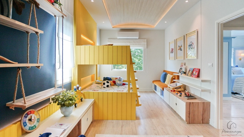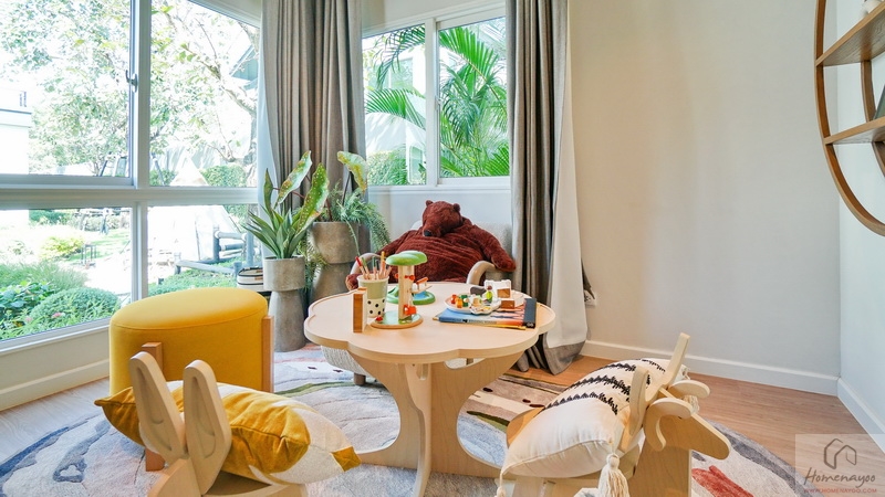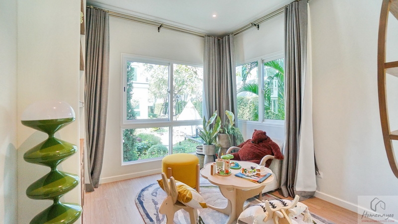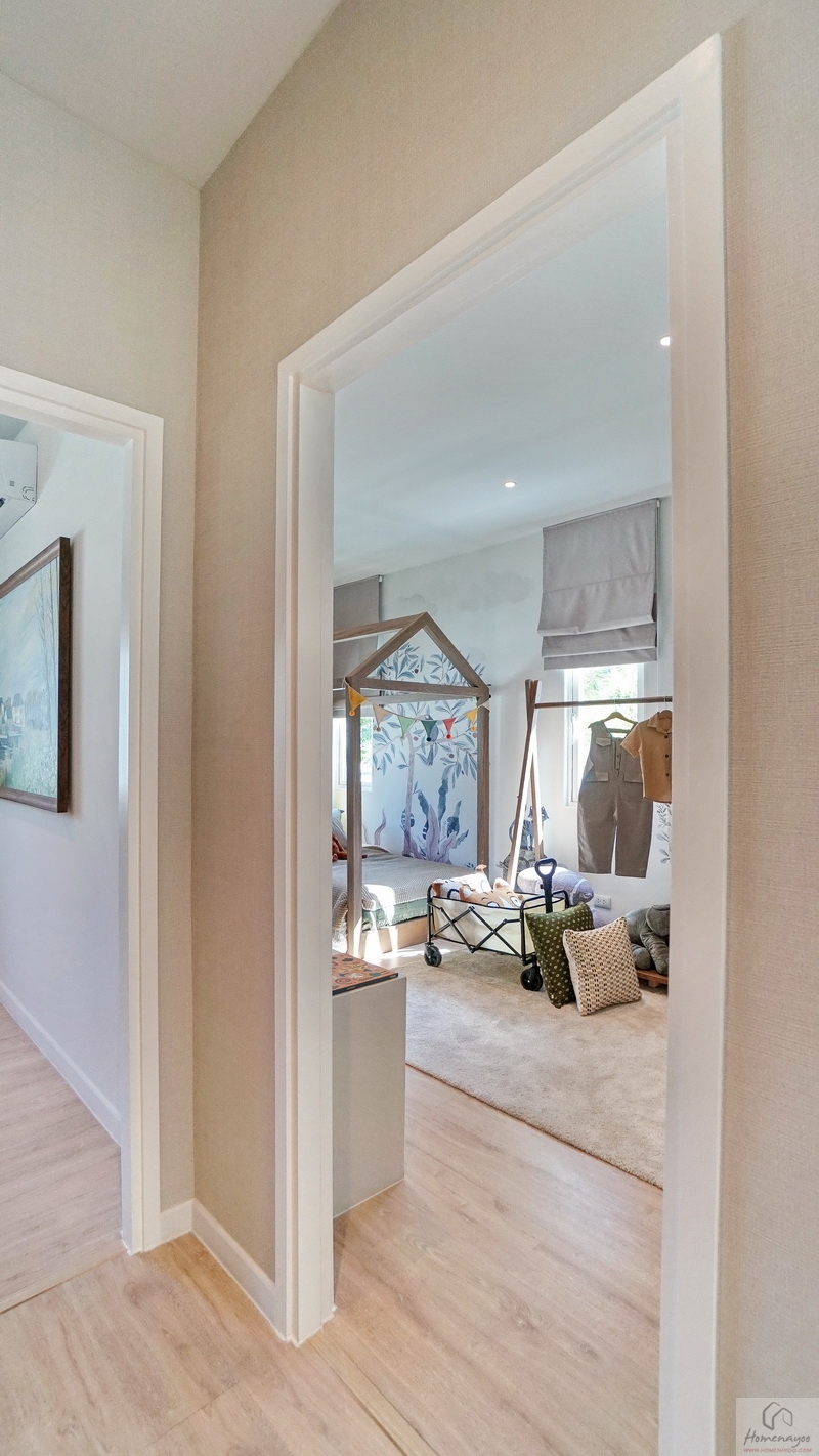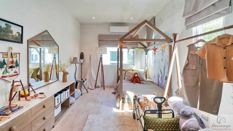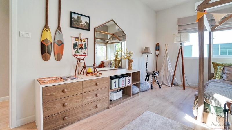 สำหรับบ้านตัวอย่างตกแต่งมาเป็นห้องนอนเด็กสีสันสดใสให้ดูเป็นไอเดีย ภายในขนาดกว้างจัดวางเฟอร์นิเจอร์มาตรฐานต่าง ๆ ได้ครบชุด มีหน้าต่างเป็นช่องรับแสงขนาด Oversize ให้หลายจุด สามารถรองรับการขยายของครอบครัวในอนาคต