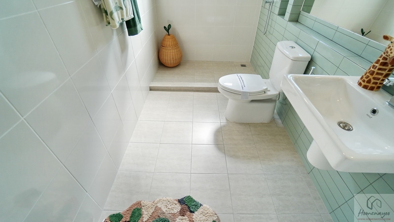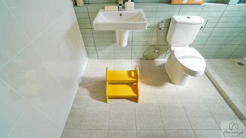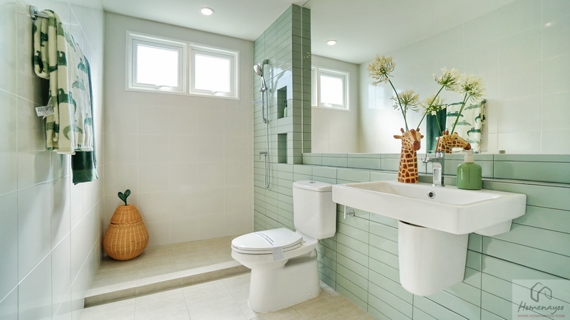 ขณะที่ห้องน้ำในตัวพื้นที่ใช้งานกว้าง ตกแต่งพื้นและผนังด้วยกระเบื้องโทนสีขาว-เทา แซมด้วยกระเบื้องโทนสีเขียว Pastel สุขภัณฑ์มาตรฐานใช้ของ COTTO หรือเทียบเท่า จัดฟังก์ชันครบทั้งมุมอ่างล้างหน้า, มุมโถสุขภัณฑ์แบบ 2 Piece ระบบ Dual Flush, มุมอาบน้ำที่แยกส่วนแห้ง-ส่วนเปียกด้วยขอบธรณี มีหน้าต่างกระจกฝ้าบานกระทุ้งช่วยระบายอากาศให้ 2 ชุด