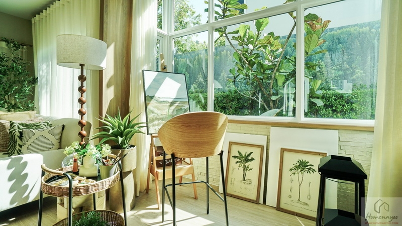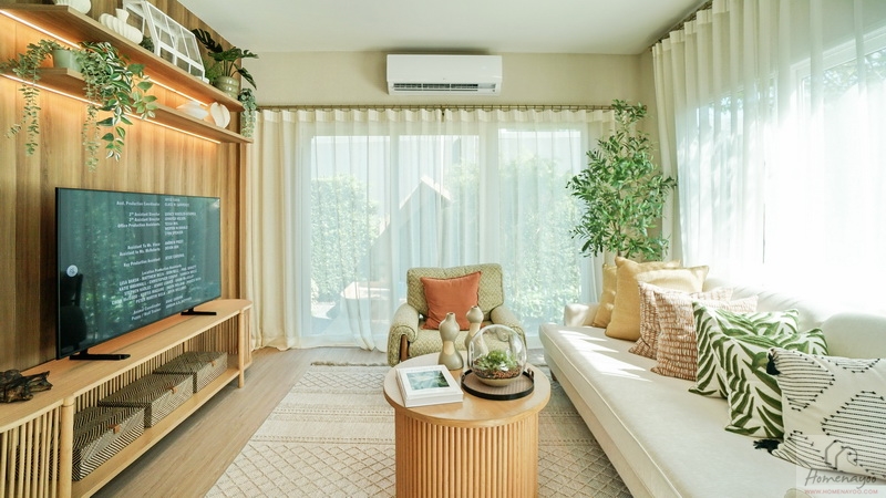 มีประตูกระจกบานเลื่อนเปิดเชื่อมกับสวนข้างตัวบ้าน หลังชุดโซฟาได้หน้าต่างบานเลื่อนที่มาพร้อมช่องระบายอากาศ Breeze Panel จะเห็นได้ว่าบริเวณนี้โอบล้อมไปด้วยช่องแสงแบบรอบด้านเลย เชื่อมโยงธรรมชาติเข้ากับการอยู่อาศัย มองเห็นต้นไม้, สนามหญ้า หรือแสงแดดได้ตลอดเวลา ช่วยให้รู้สึกผ่อนคลาย สงบ และลดความเครียดได้