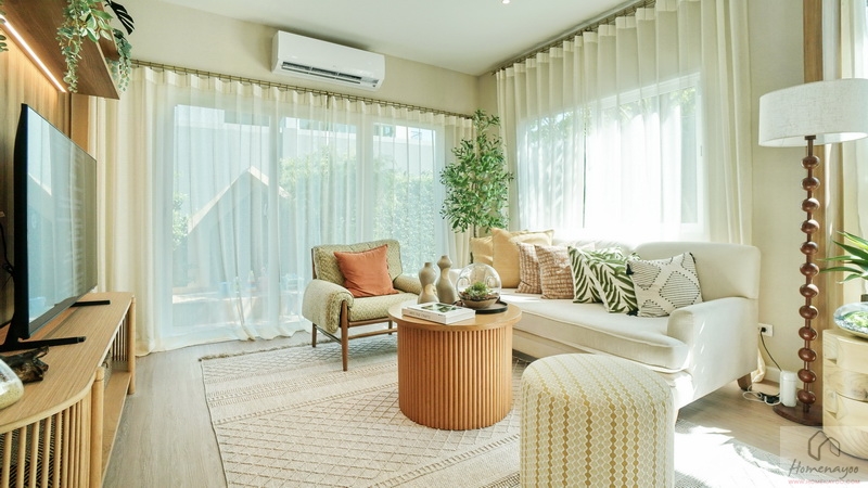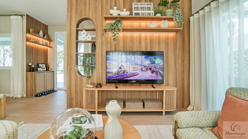 ระยะห่างจากโซฟาและชั้นวางทีวีกว้างทำให้นั่งดูทีวีจอใหญ่ได้ในระยะสบายสายตา มีพื้นที่เหลือให้เดินเข้า-ออกสะดวก