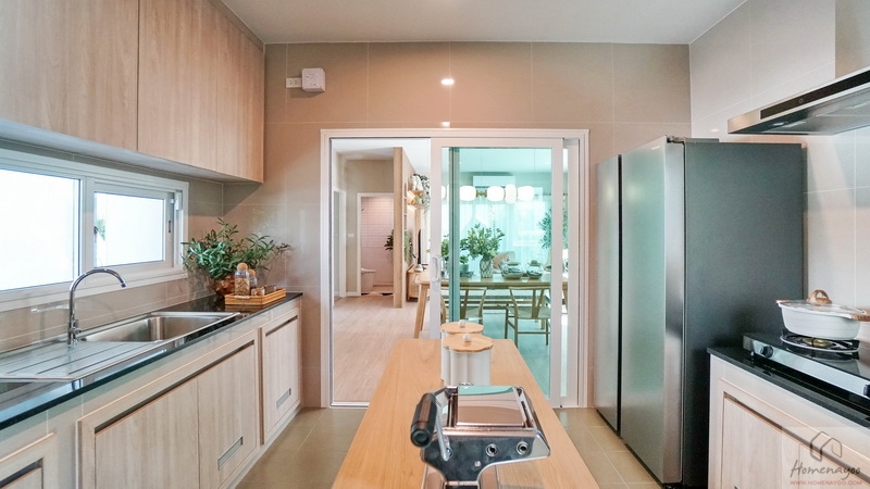 ถัดเข้าไปคือห้องครัวไทยแยกเป็นสัดส่วนกั้นด้วยประตูกระจกบานเลื่อน ป้องกันกลิ่นและควันจะไม่คลุ้งออกมายังโซนพักอาศัย