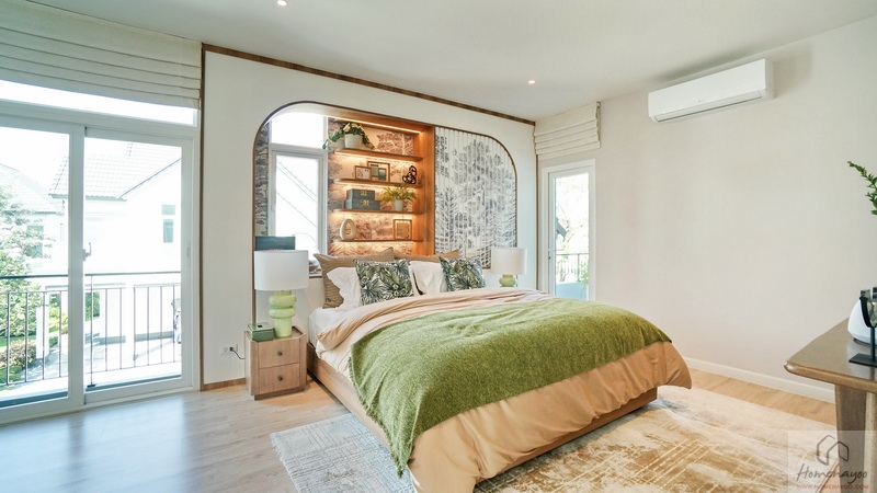 ฝั่งหัวเตียงวางโต๊ะขนาดกะทัดรัดได้ทั้ง 2 ฝั่ง มีหน้าต่างกระจกบานเลื่อนขนาดใหญ่ให้ 1 บาน