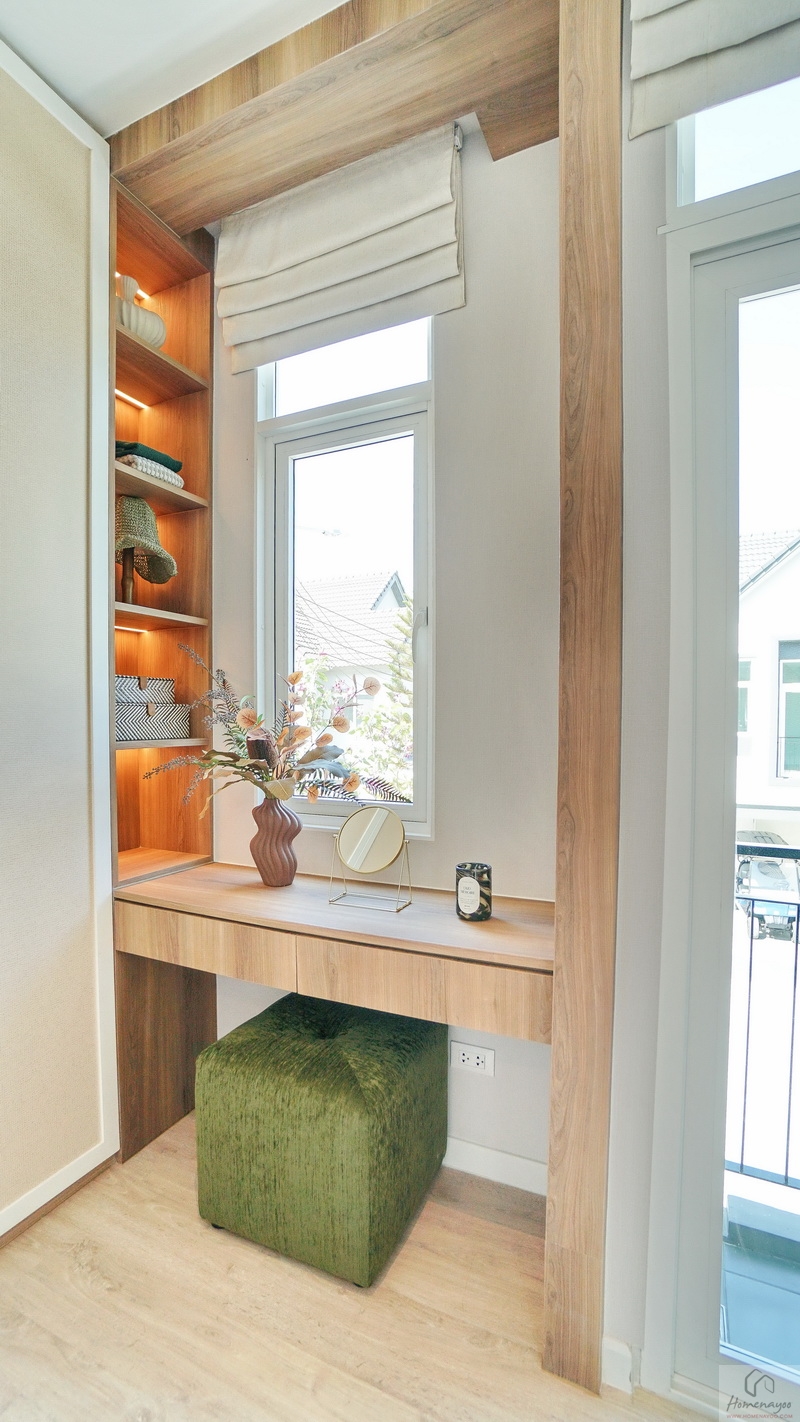 ตรงกลางจัดเป็นมุมโต๊ะเครื่องแป้งขนาดมาตรฐานชิดช่องแสงบานผสม