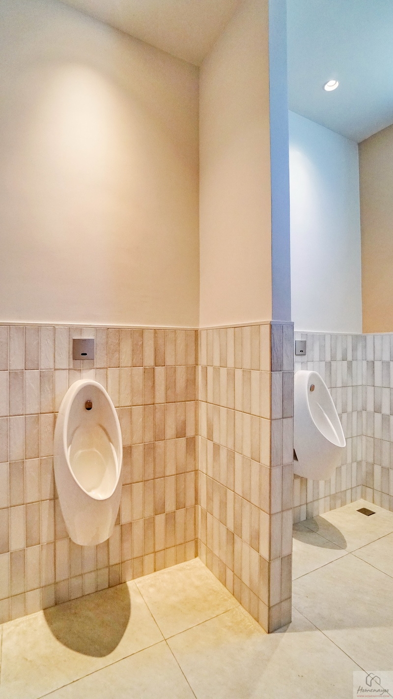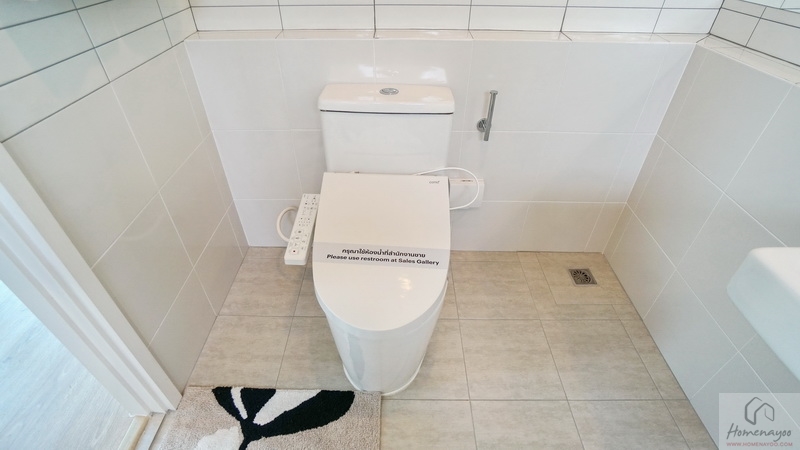 ห้องน้ำชั้นล่างแบบ Powder Room พื้นที่ใช้งานกว้างกำลังดี ปูพื้นและผนังด้วยกระเบื้องโทนสีขาว-เทา สุขภัณฑ์มาตรฐานใช้ของ COTTO หรือเทียบเท่า มีหน้าต่างกระจกฝ้าบานกระทุ้งช่วยระบายอากาศให้ 1 ชุด
