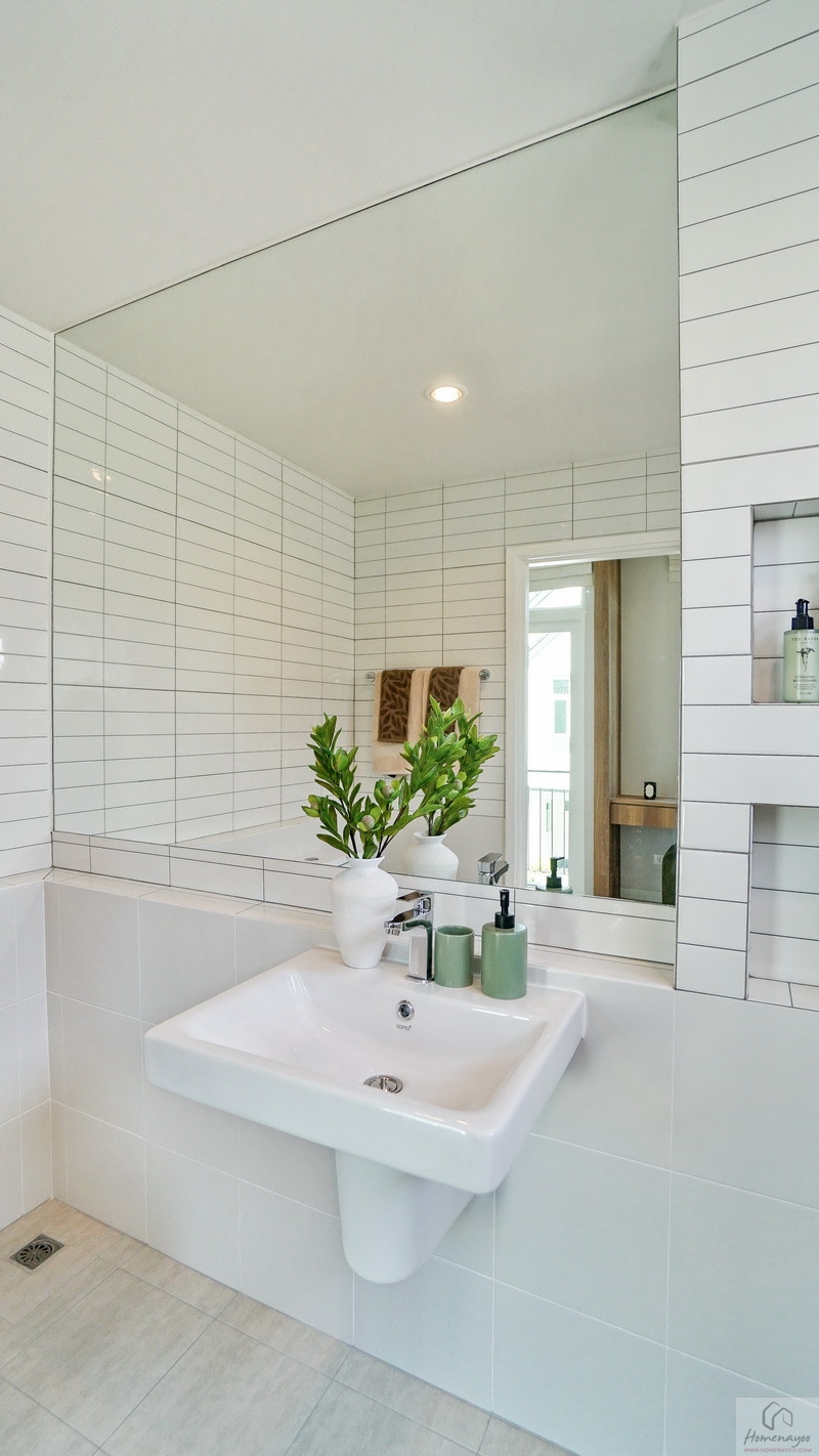 มุมอ่างล้างหน้าใช้ทรงเหลี่ยมแบบแขวนผนังคู่ก็อกน้ำโครเมียมแบบปัดขึ้น บนผนังติดกระจกเงาบานใหญ่ให้ 1 บาน
