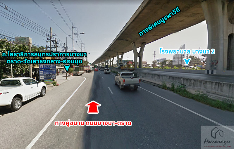 จากนั้นวิ่งตรงตาม ทางคู่ขนาน ถนนบางนา – ตราด ผ่านซ้ายมือ ถนนวัดศรีวรีน้อย