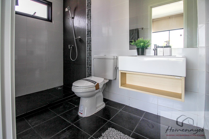 สำหรับห้องน้ำที่ชั้น 1 ของบ้านหลังนี้เมื่อเปิดเข้ามา ก็จะเจอกับโถสุขภัณฑ์ด้านหน้าเลยค่ะแล้วแยกออก ด้านซ้ายมือเป็นอ่างล้างหน้า ขวามือเป็นส่วนอาบน้ำ สุขภัณฑ์ทุกอย่างได้เหมือนกันกับบ้านหลังที่แล้วค่ะ